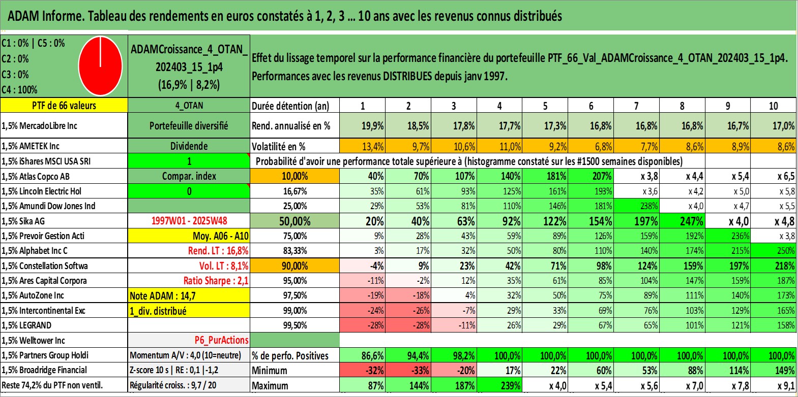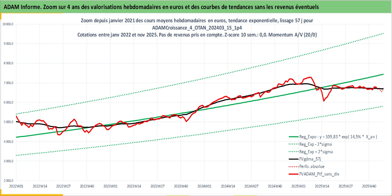 Site dédié aux investisseursPage dédiée sur site financeAnalyse des valorisations hebdomadaires du portefeuille ADAMCroissance_4_OTAN_202403_15_1p4_66actifs avec un profil P6_PurActions. Ce portefeuille est cote en EUR. Les valorisations couvrent les semaines 1997W01 a 2025W48. Les revenus de cet actif financier sont pris en compte depuis la semaine 1997W01. La note globale ESG de cet actif est estimee a 11.0 (apres rebasage entre 0 et 20).