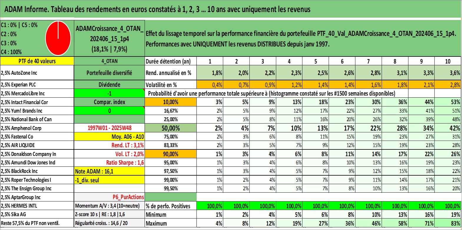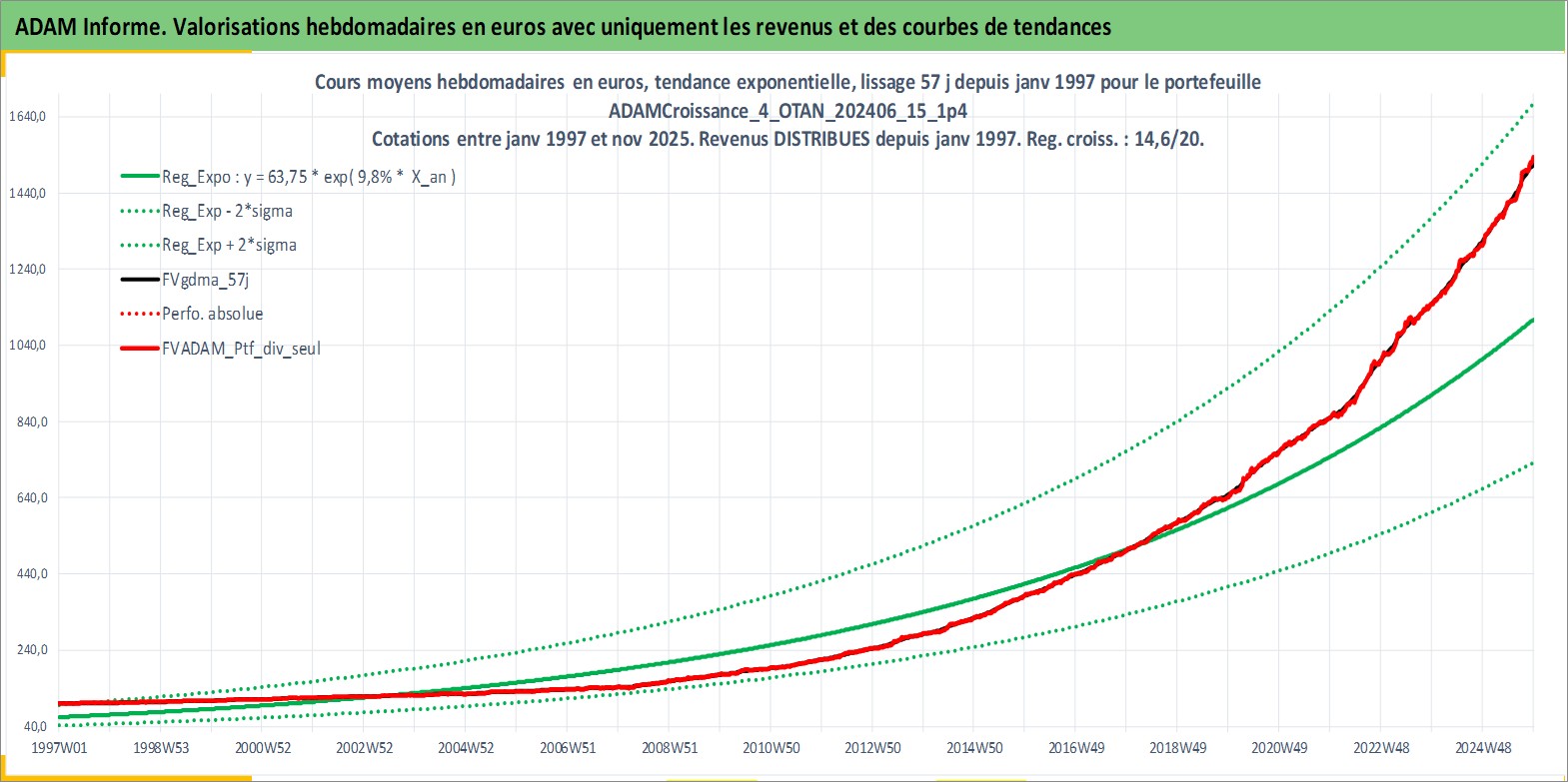 Site dédié aux investisseursPage dédiée sur site financeAnalyse des valorisations hebdomadaires du portefeuille ADAMCroissance_4_OTAN_202406_15_1p4_40actifs avec un profil P6_PurActions. Ce portefeuille est cote en EUR. Les valorisations couvrent les semaines 1997W01 a 2025W48. Les revenus de cet actif financier sont pris en compte depuis la semaine 1997W01. La note globale ESG de cet actif est estimee a 10.9 (apres rebasage entre 0 et 20).