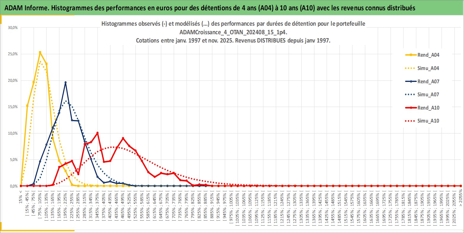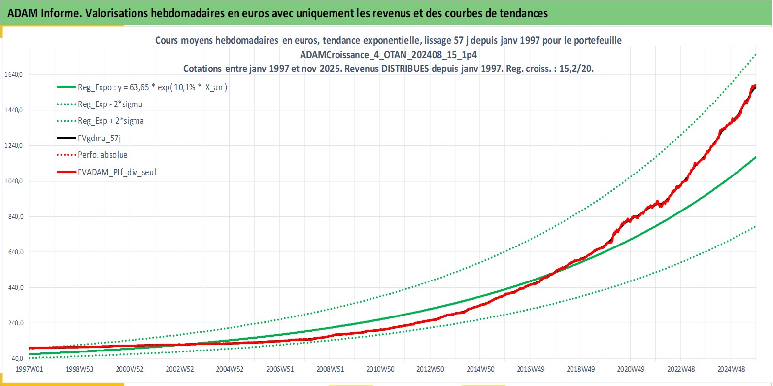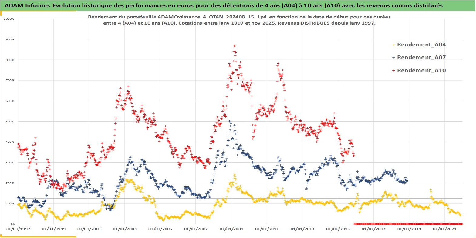 Site dédié aux investisseursPage dédiée sur site financeAnalyse des valorisations hebdomadaires du portefeuille ADAMCroissance_4_OTAN_202408_15_1p4_42actifs avec un profil P6_PurActions. Ce portefeuille est cote en EUR. Les valorisations couvrent les semaines 1997W01 a 2025W48. Les revenus de cet actif financier sont pris en compte depuis la semaine 1997W01. La note globale ESG de cet actif est estimee a 10.6 (apres rebasage entre 0 et 20).