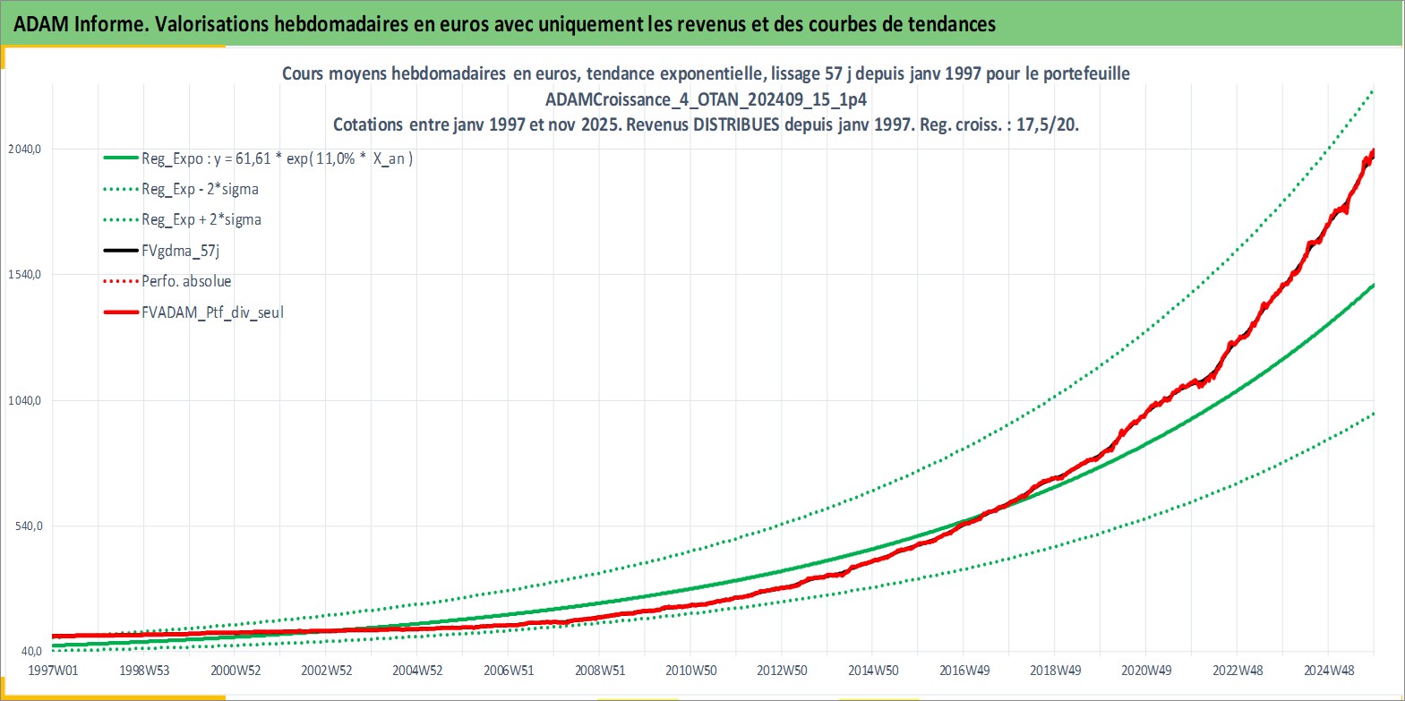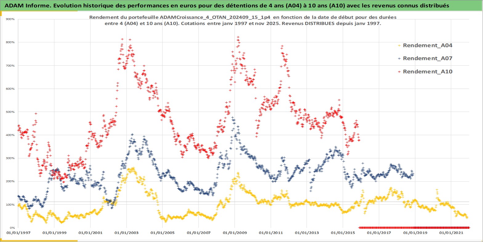 Site dédié aux investisseursPage dédiée sur site financeAnalyse des valorisations hebdomadaires du portefeuille ADAMCroissance_4_OTAN_202409_15_1p4_32actifs avec un profil P6_PurActions. Ce portefeuille est cote en EUR. Les valorisations couvrent les semaines 1997W01 a 2025W48. Les revenus de cet actif financier sont pris en compte depuis la semaine 1997W01. La note globale ESG de cet actif est estimee a 10.2 (apres rebasage entre 0 et 20).