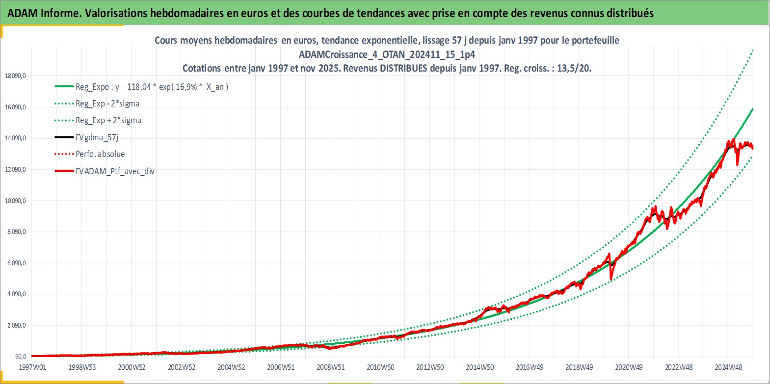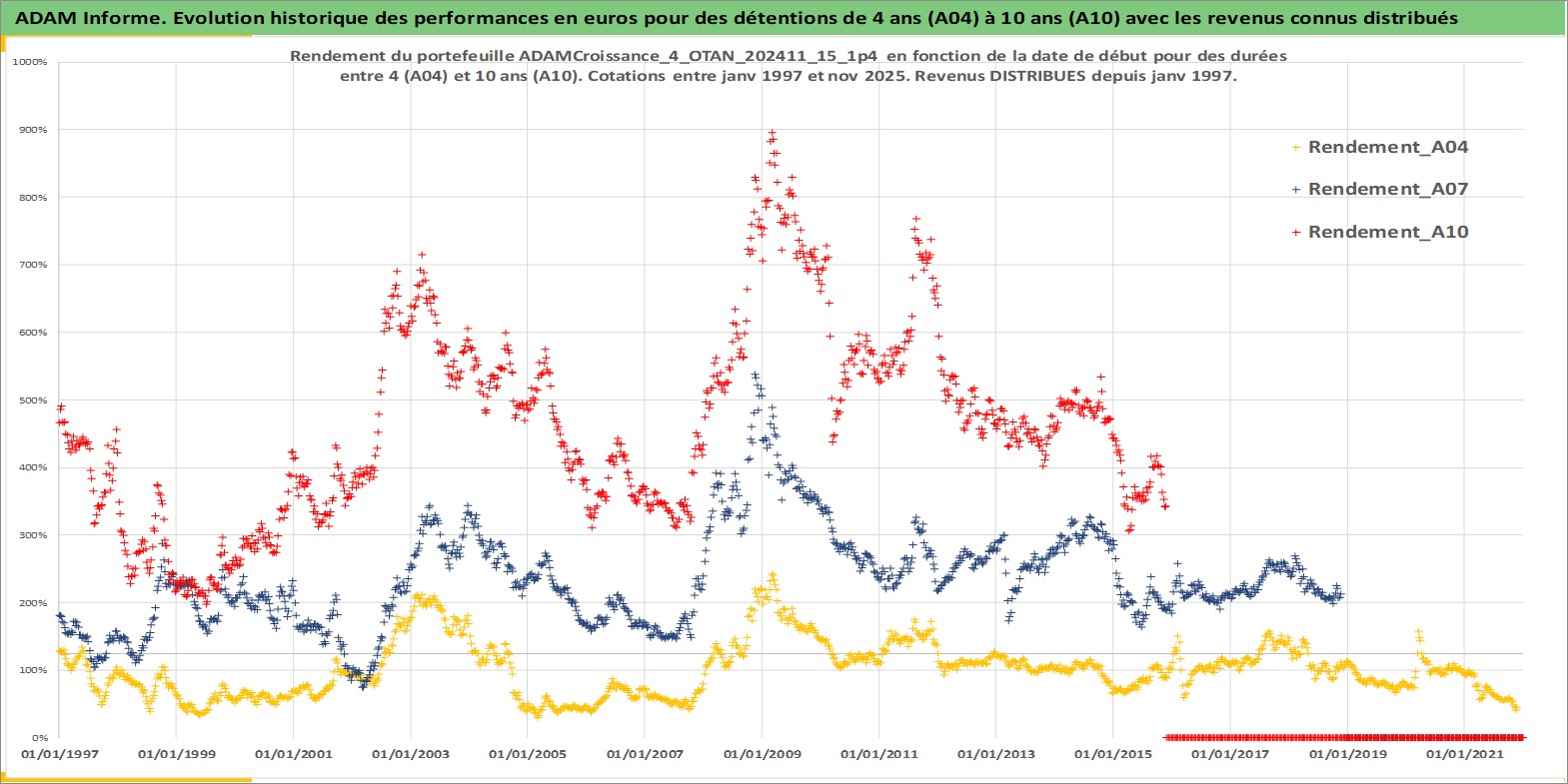Site dédié aux investisseursPage dédiée sur site financeAnalyse des valorisations hebdomadaires du portefeuille ADAMCroissance_4_OTAN_202411_15_1p4_41actifs avec un profil P6_PurActions. Ce portefeuille est cote en EUR. Les valorisations couvrent les semaines 1997W01 a 2025W48. Les revenus de cet actif financier sont pris en compte depuis la semaine 1997W01. La note globale ESG de cet actif est estimee a 10.8 (apres rebasage entre 0 et 20).