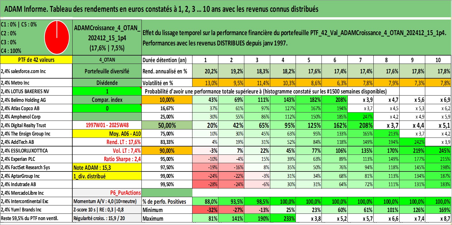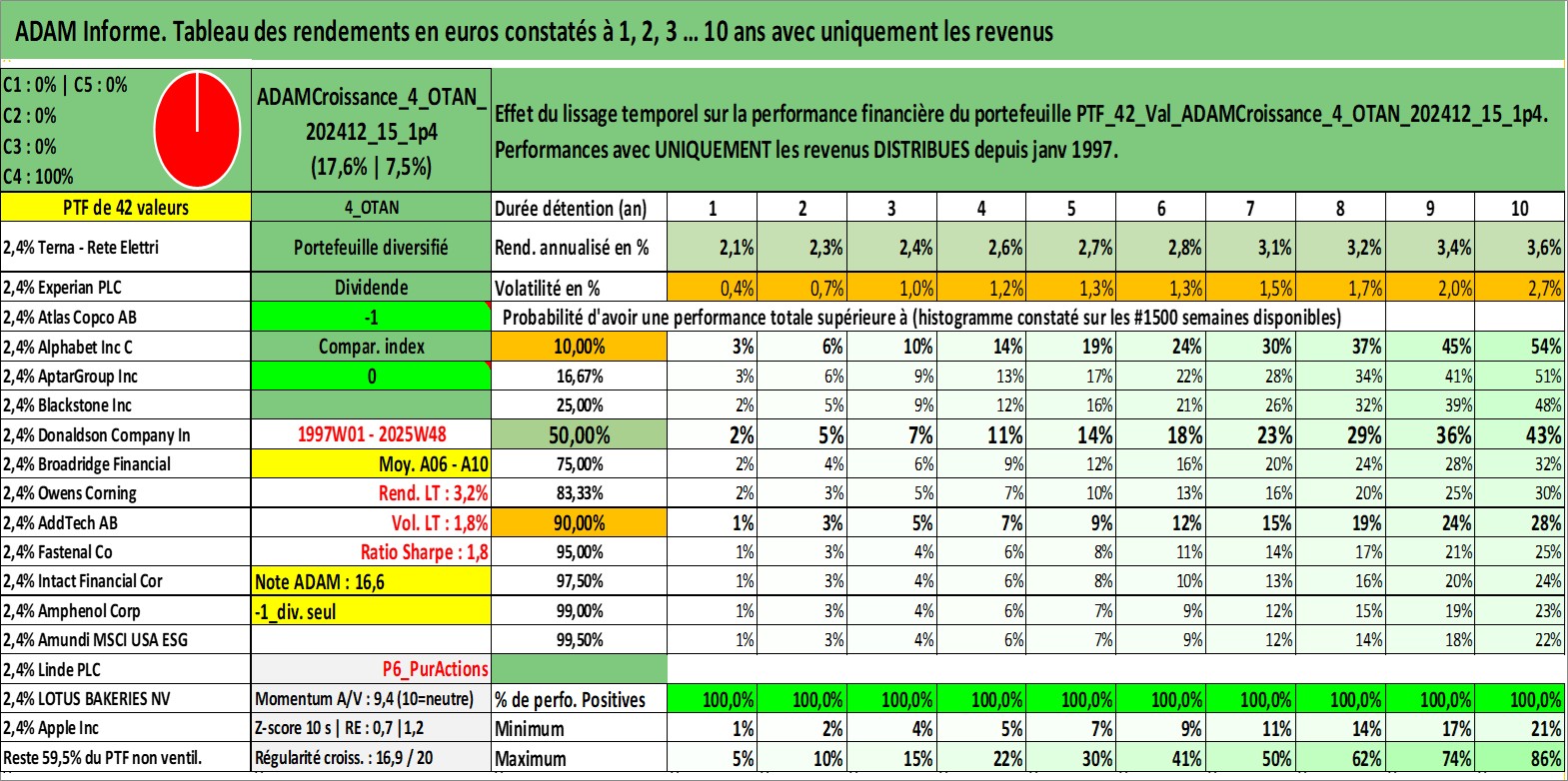 Site dédié aux investisseursPage dédiée sur site financeAnalyse des valorisations hebdomadaires du portefeuille ADAMCroissance_4_OTAN_202412_15_1p4_42actifs avec un profil P6_PurActions. Ce portefeuille est cote en EUR. Les valorisations couvrent les semaines 1997W01 a 2025W48. Les revenus de cet actif financier sont pris en compte depuis la semaine 1997W01. La note globale ESG de cet actif est estimee a 10.9 (apres rebasage entre 0 et 20).