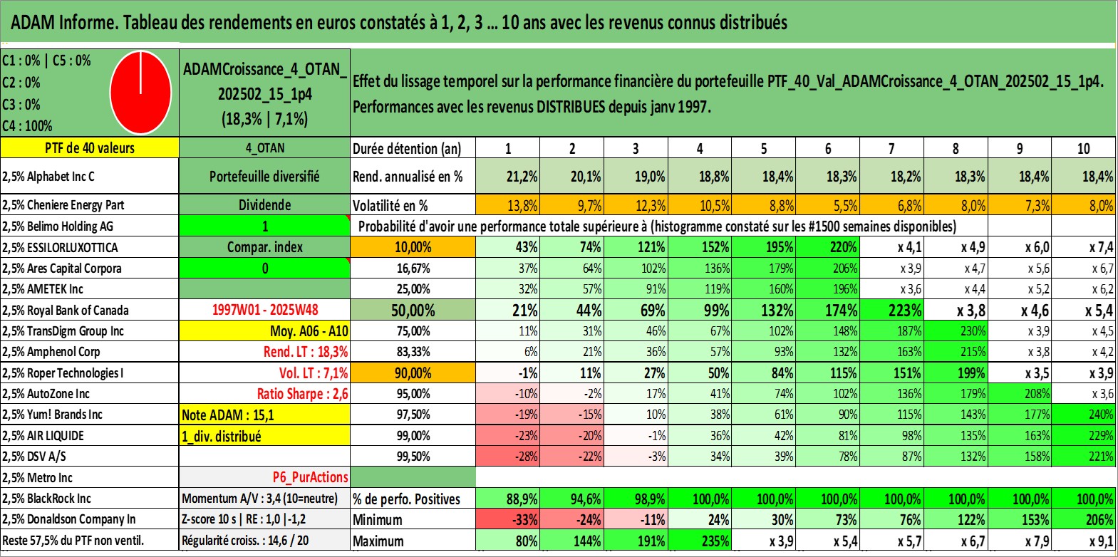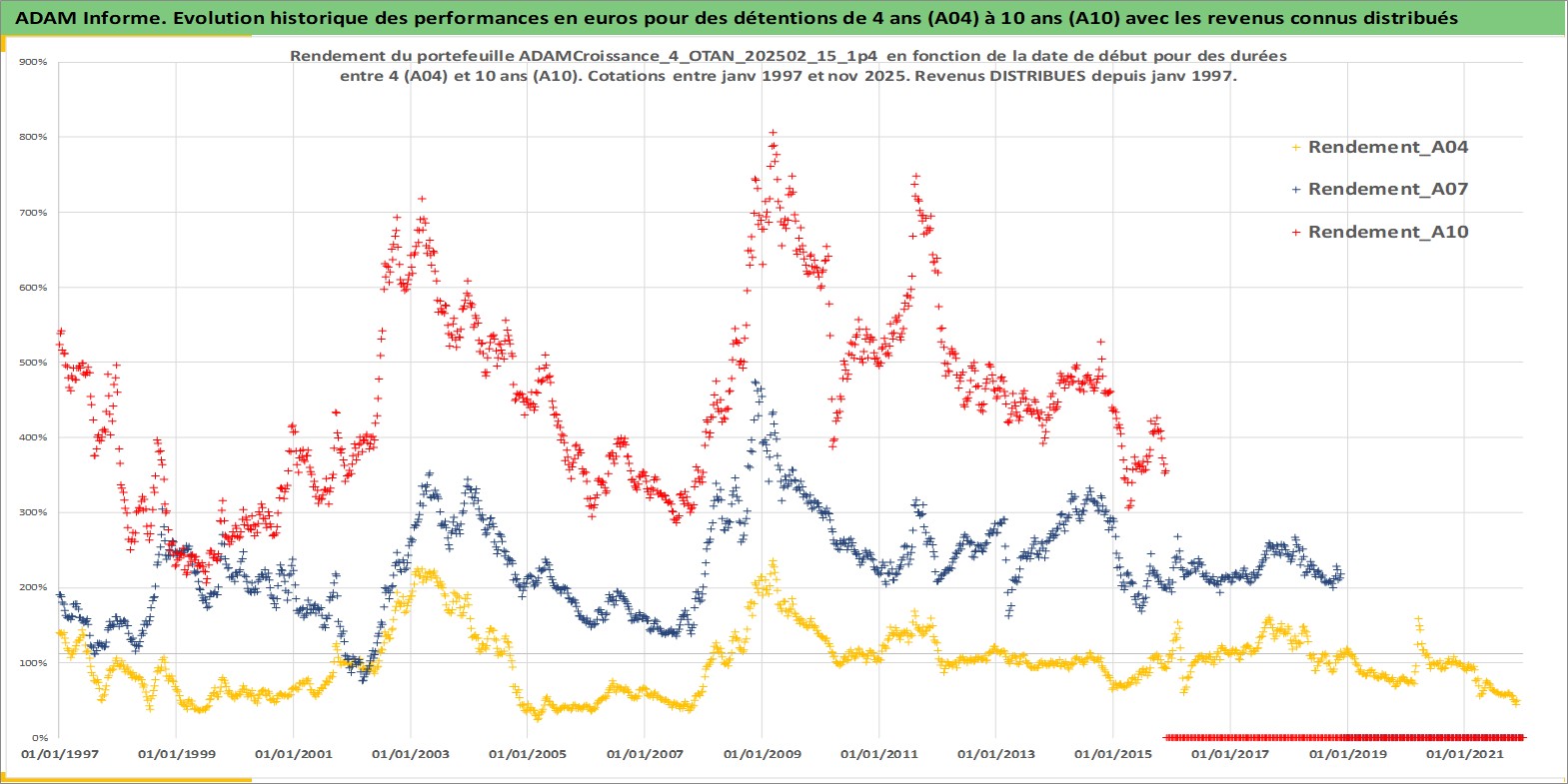 Site dédié aux investisseursPage dédiée sur site financeAnalyse des valorisations hebdomadaires du portefeuille ADAMCroissance_4_OTAN_202502_15_1p4_40actifs avec un profil P6_PurActions. Ce portefeuille est cote en EUR. Les valorisations couvrent les semaines 1997W01 a 2025W48. Les revenus de cet actif financier sont pris en compte depuis la semaine 1997W01. La note globale ESG de cet actif est estimee a 10.7 (apres rebasage entre 0 et 20).