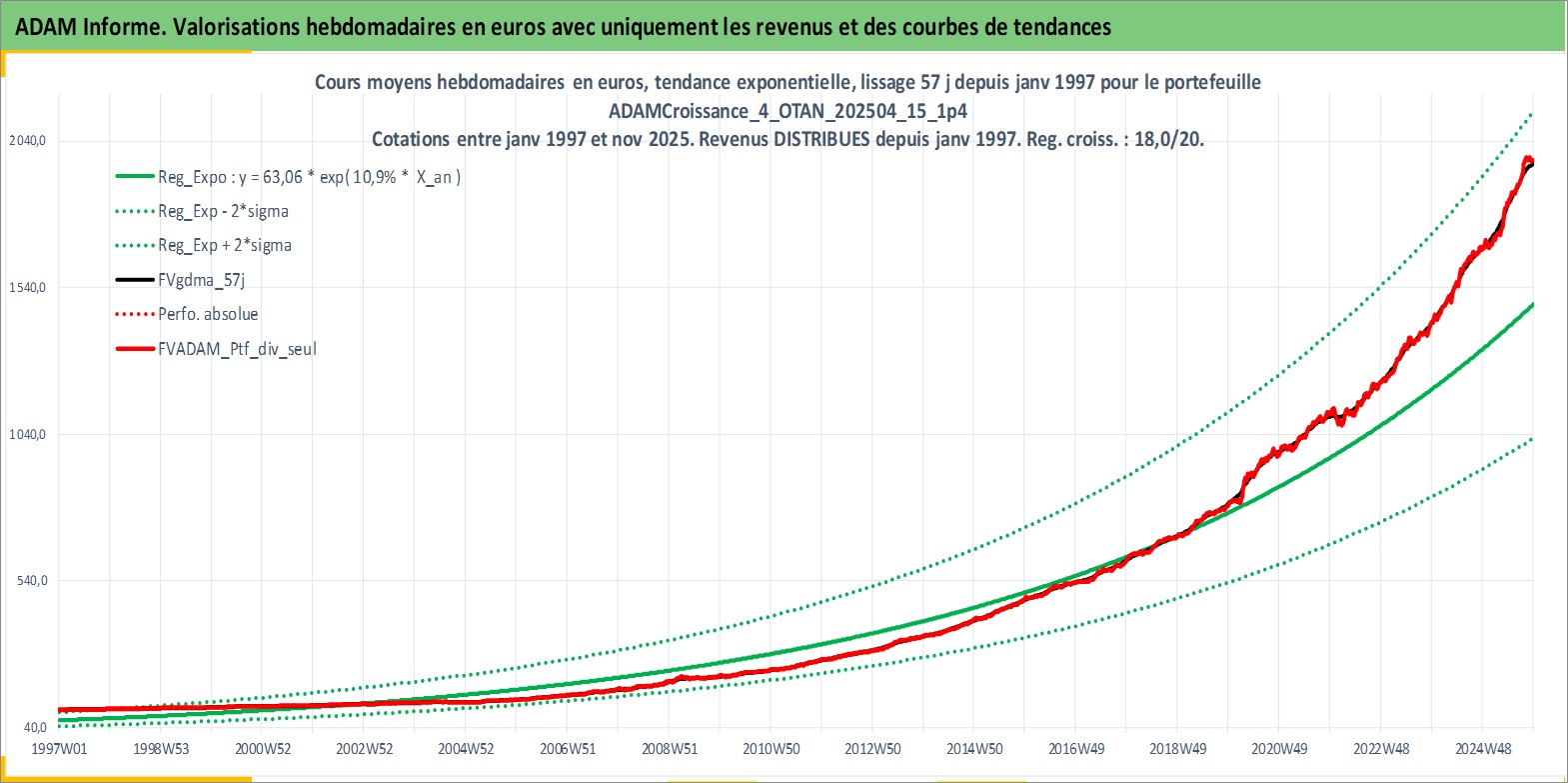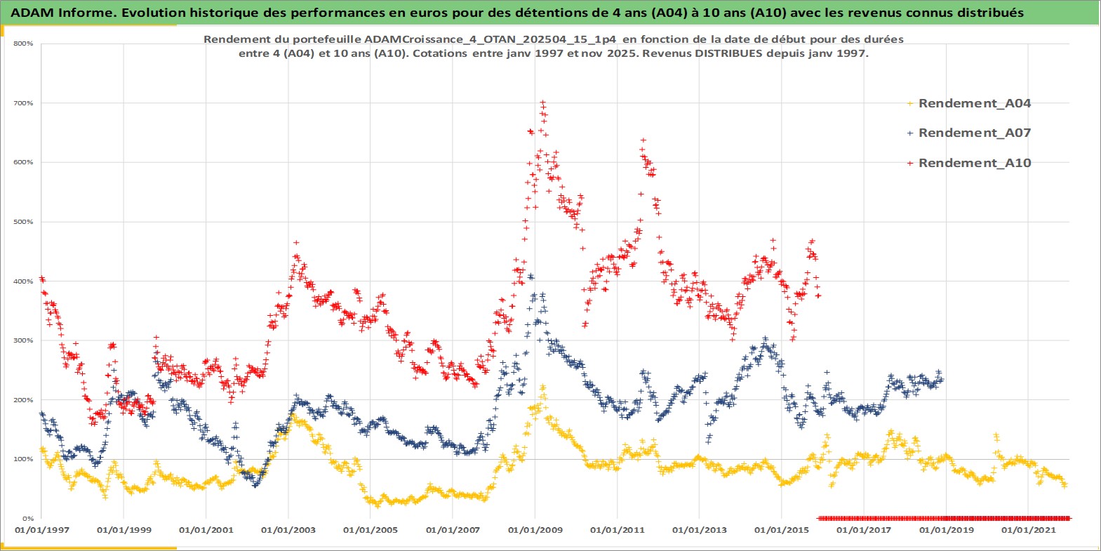 Site dédié aux investisseursPage dédiée sur site financeAnalyse des valorisations hebdomadaires du portefeuille ADAMCroissance_4_OTAN_202504_15_1p4_22actifs avec un profil P6_PurActions. Ce portefeuille est cote en EUR. Les valorisations couvrent les semaines 1997W01 a 2025W48. Les revenus de cet actif financier sont pris en compte depuis la semaine 1997W01. La note globale ESG de cet actif est estimee a 11.4 (apres rebasage entre 0 et 20).