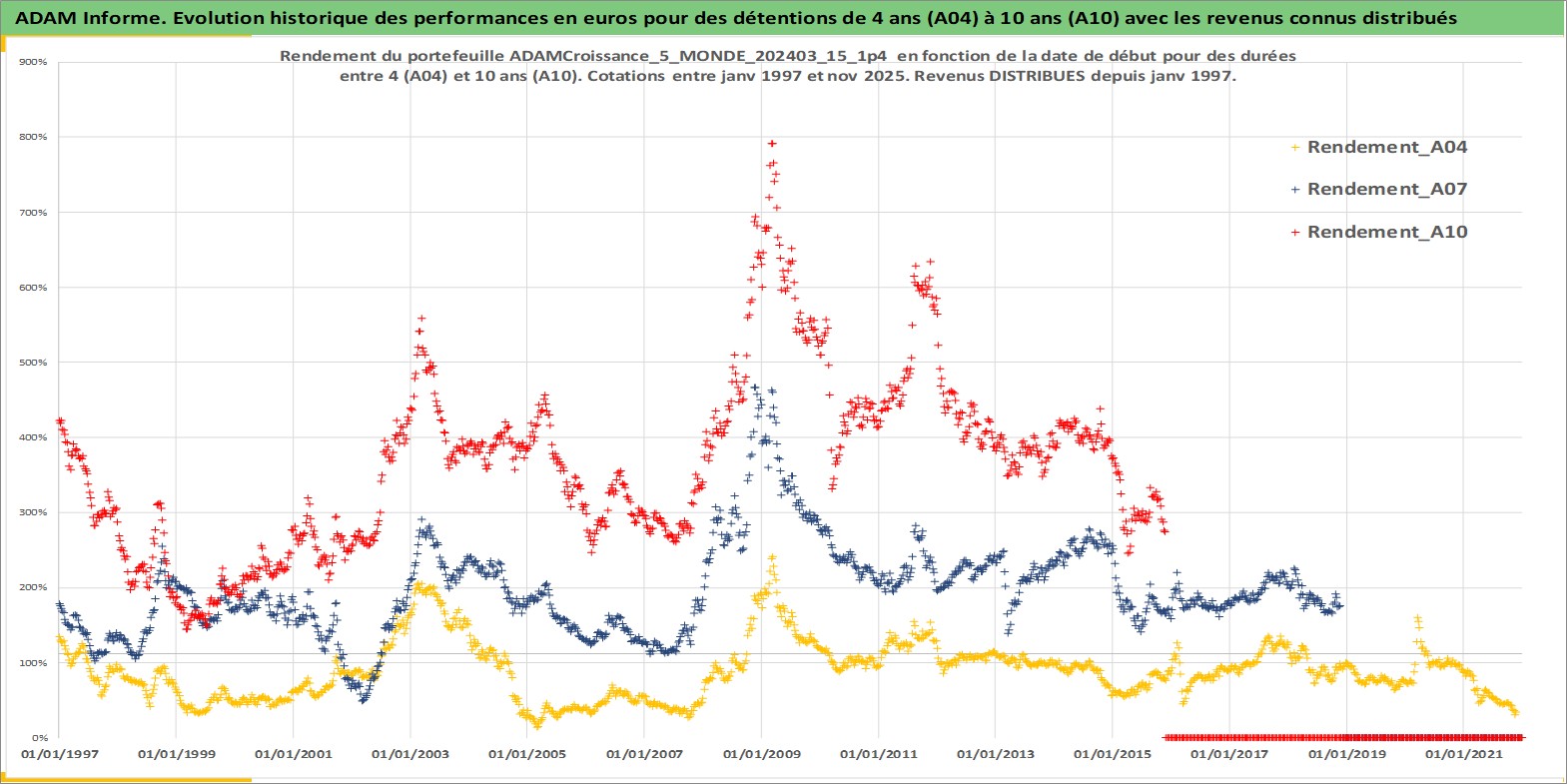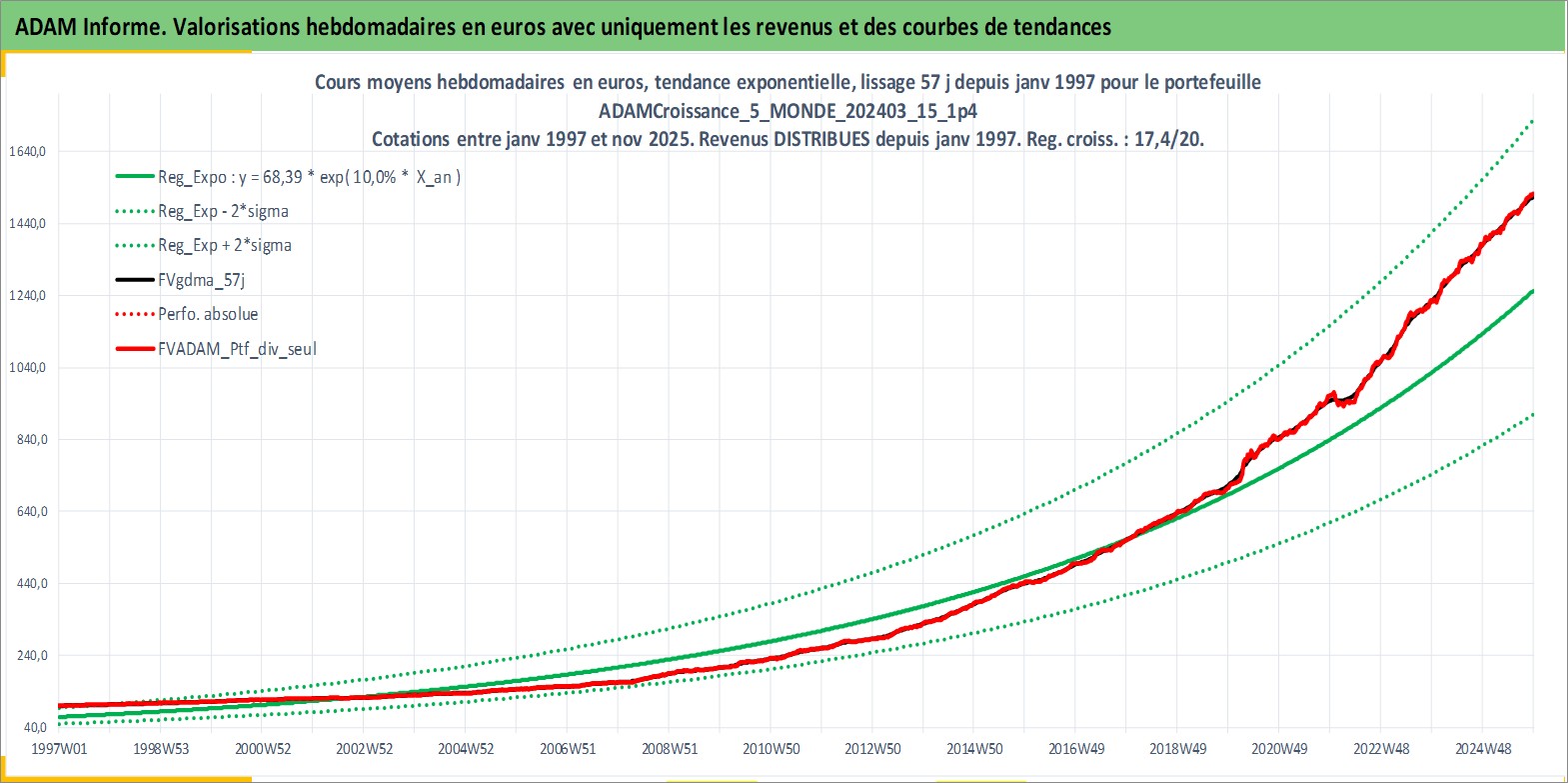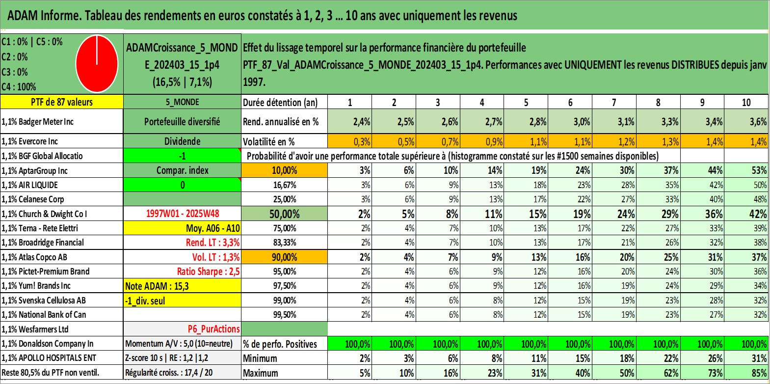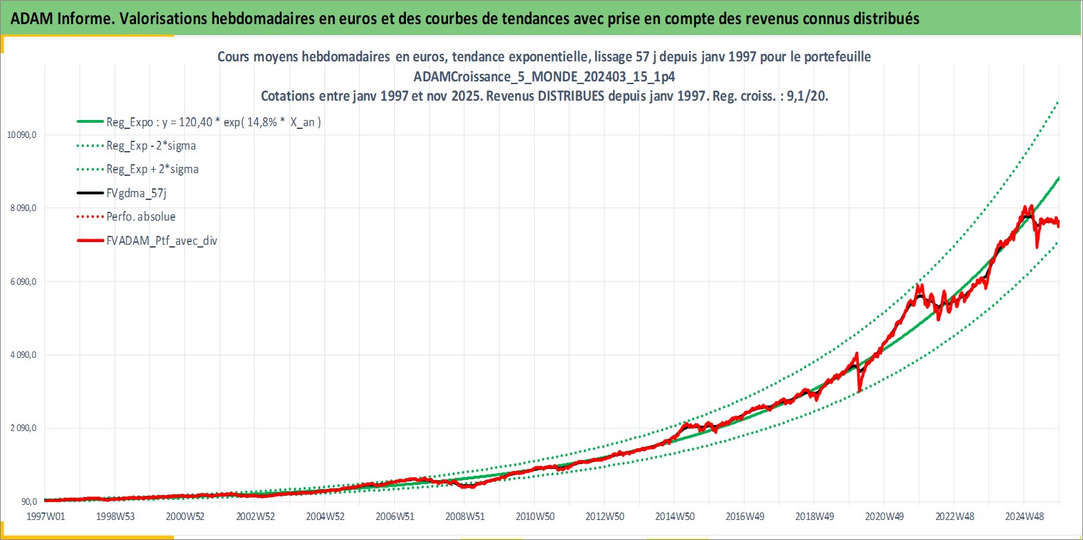Site dédié aux investisseursPage dédiée sur site financeAnalyse des valorisations hebdomadaires du portefeuille ADAMCroissance_5_MONDE_202403_15_1p4_87actifs avec un profil P6_PurActions. Ce portefeuille est cote en EUR. Les valorisations couvrent les semaines 1997W01 a 2025W48. Les revenus de cet actif financier sont pris en compte depuis la semaine 1997W01. La note globale ESG de cet actif est estimee a 10.8 (apres rebasage entre 0 et 20).