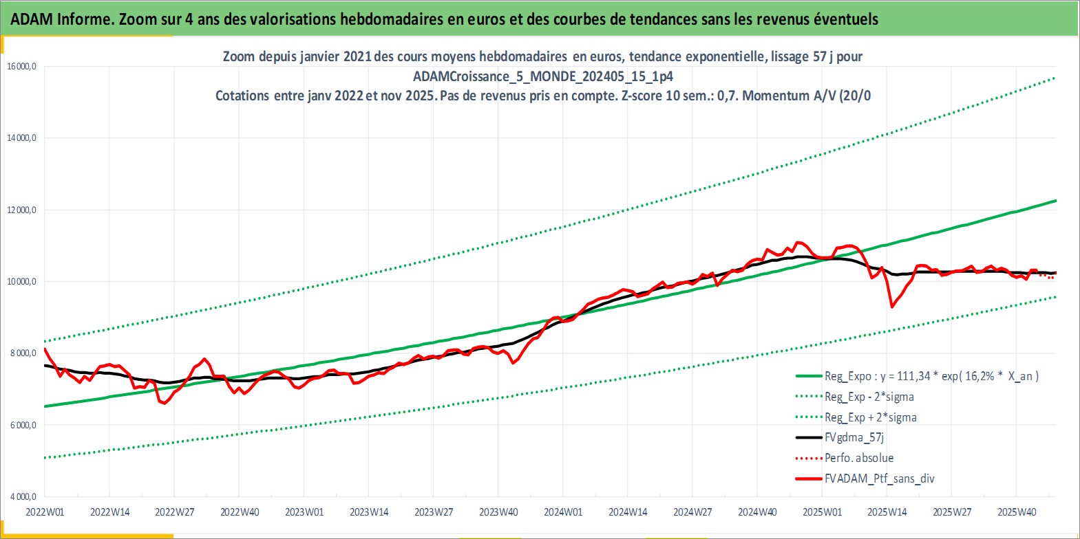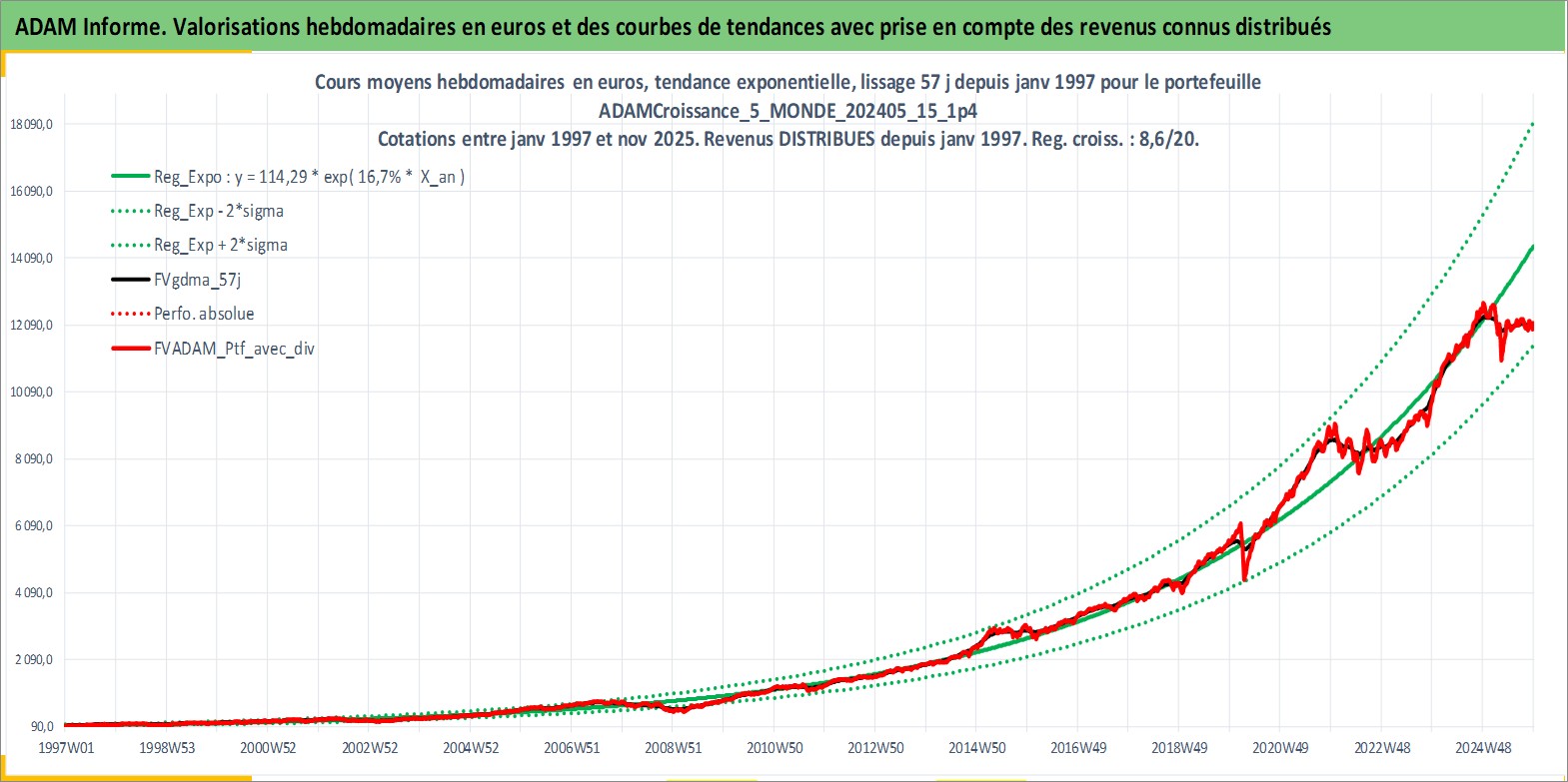 Site dédié aux investisseursPage dédiée sur site financeAnalyse des valorisations hebdomadaires du portefeuille ADAMCroissance_5_MONDE_202405_15_1p4_37actifs avec un profil P6_PurActions. Ce portefeuille est cote en EUR. Les valorisations couvrent les semaines 1997W01 a 2025W48. Les revenus de cet actif financier sont pris en compte depuis la semaine 1997W01. La note globale ESG de cet actif est estimee a 10.4 (apres rebasage entre 0 et 20).