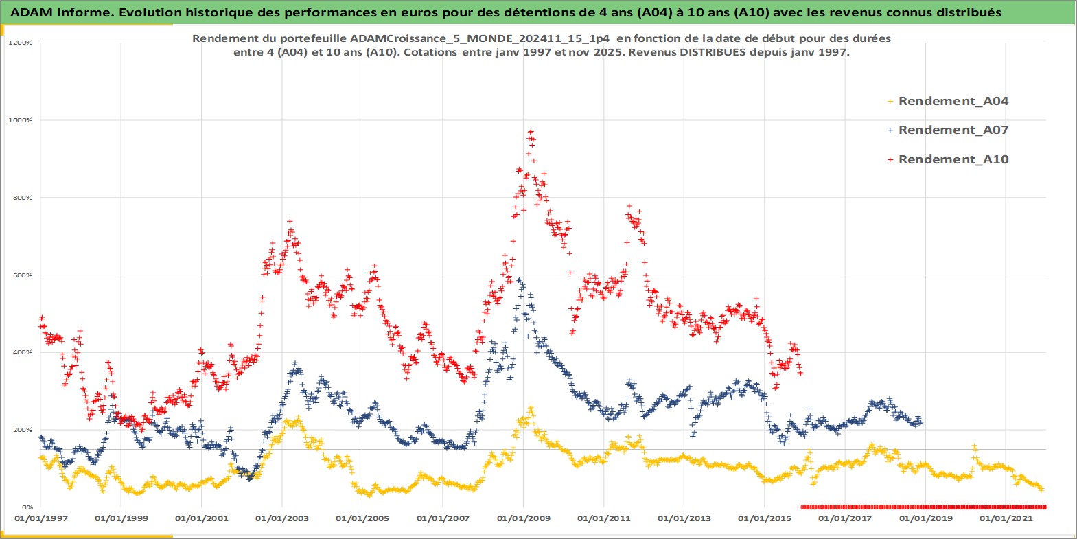 Site dédié aux investisseursPage dédiée sur site financeAnalyse des valorisations hebdomadaires du portefeuille ADAMCroissance_5_MONDE_202411_15_1p4_45actifs avec un profil P6_PurActions. Ce portefeuille est cote en EUR. Les valorisations couvrent les semaines 1997W01 a 2025W48. Les revenus de cet actif financier sont pris en compte depuis la semaine 1997W01. La note globale ESG de cet actif est estimee a 10.9 (apres rebasage entre 0 et 20).