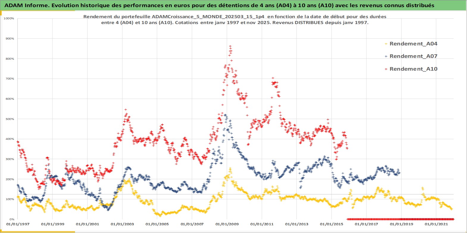 Site dédié aux investisseursPage dédiée sur site financeAnalyse des valorisations hebdomadaires du portefeuille ADAMCroissance_5_MONDE_202503_15_1p4_35actifs avec un profil P6_PurActions. Ce portefeuille est cote en EUR. Les valorisations couvrent les semaines 1997W01 a 2025W48. Les revenus de cet actif financier sont pris en compte depuis la semaine 1997W01. La note globale ESG de cet actif est estimee a 10.9 (apres rebasage entre 0 et 20).