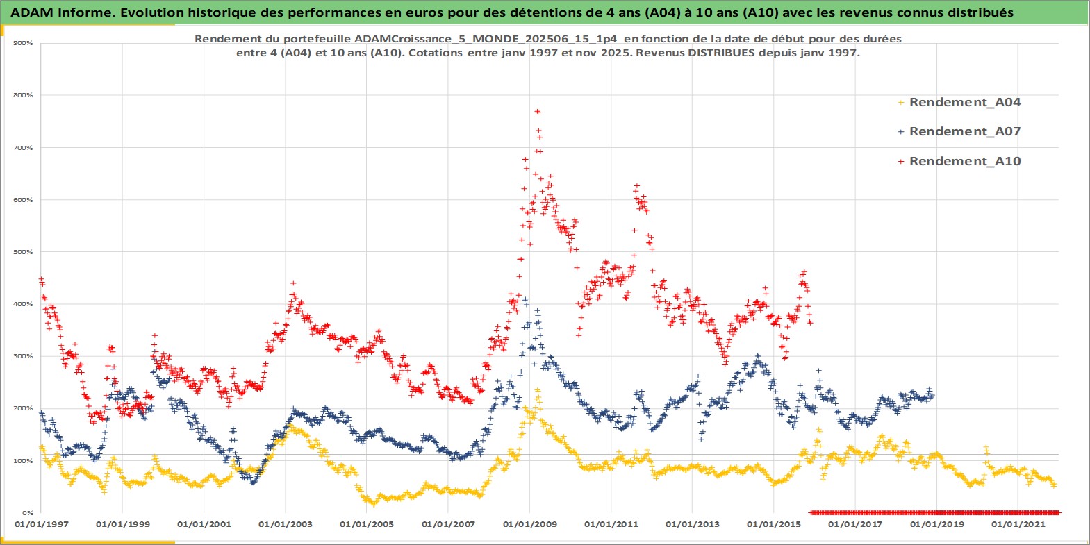 Site dédié aux investisseursPage dédiée sur site financeAnalyse des valorisations hebdomadaires du portefeuille ADAMCroissance_5_MONDE_202506_15_1p4_24actifs avec un profil P6_PurActions. Ce portefeuille est cote en EUR. Les valorisations couvrent les semaines 1997W01 a 2025W48. Les revenus de cet actif financier sont pris en compte depuis la semaine 1997W01. La note globale ESG de cet actif est estimee a 11.9 (apres rebasage entre 0 et 20).