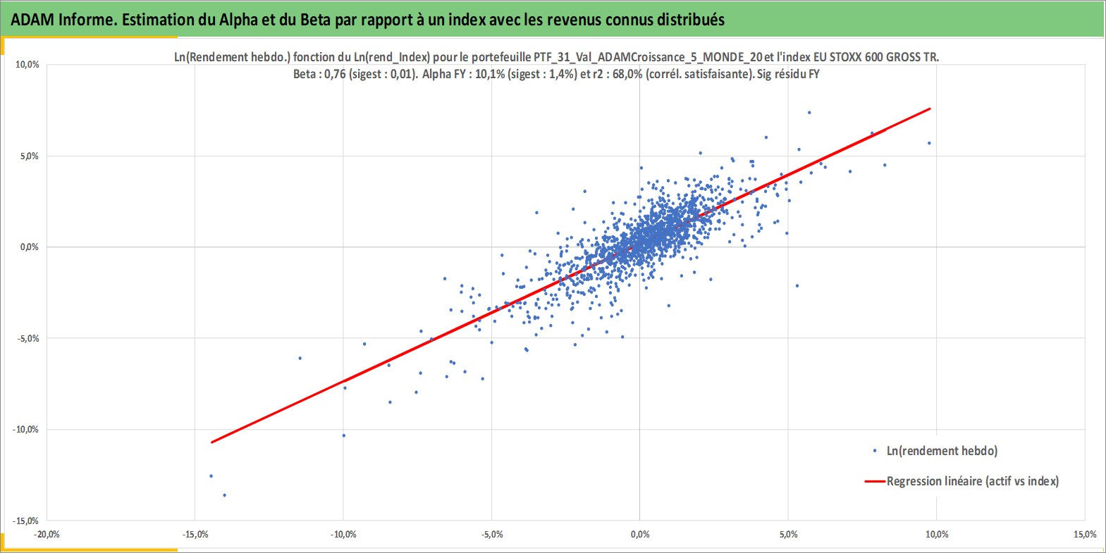 Site dédié aux investisseursPage dédiée sur site financeAnalyse des valorisations hebdomadaires du portefeuille ADAMCroissance_5_MONDE_202507_15_1p4_31actifs avec un profil P6_PurActions. Ce portefeuille est cote en EUR. Les valorisations couvrent les semaines 1997W01 a 2025W48. Les revenus de cet actif financier sont pris en compte depuis la semaine 1997W01. La note globale ESG de cet actif est estimee a 11.0 (apres rebasage entre 0 et 20).