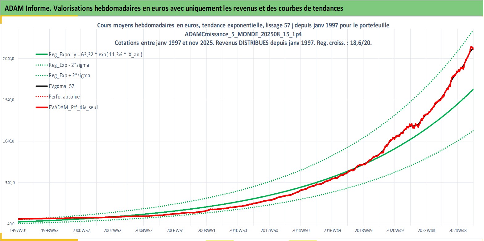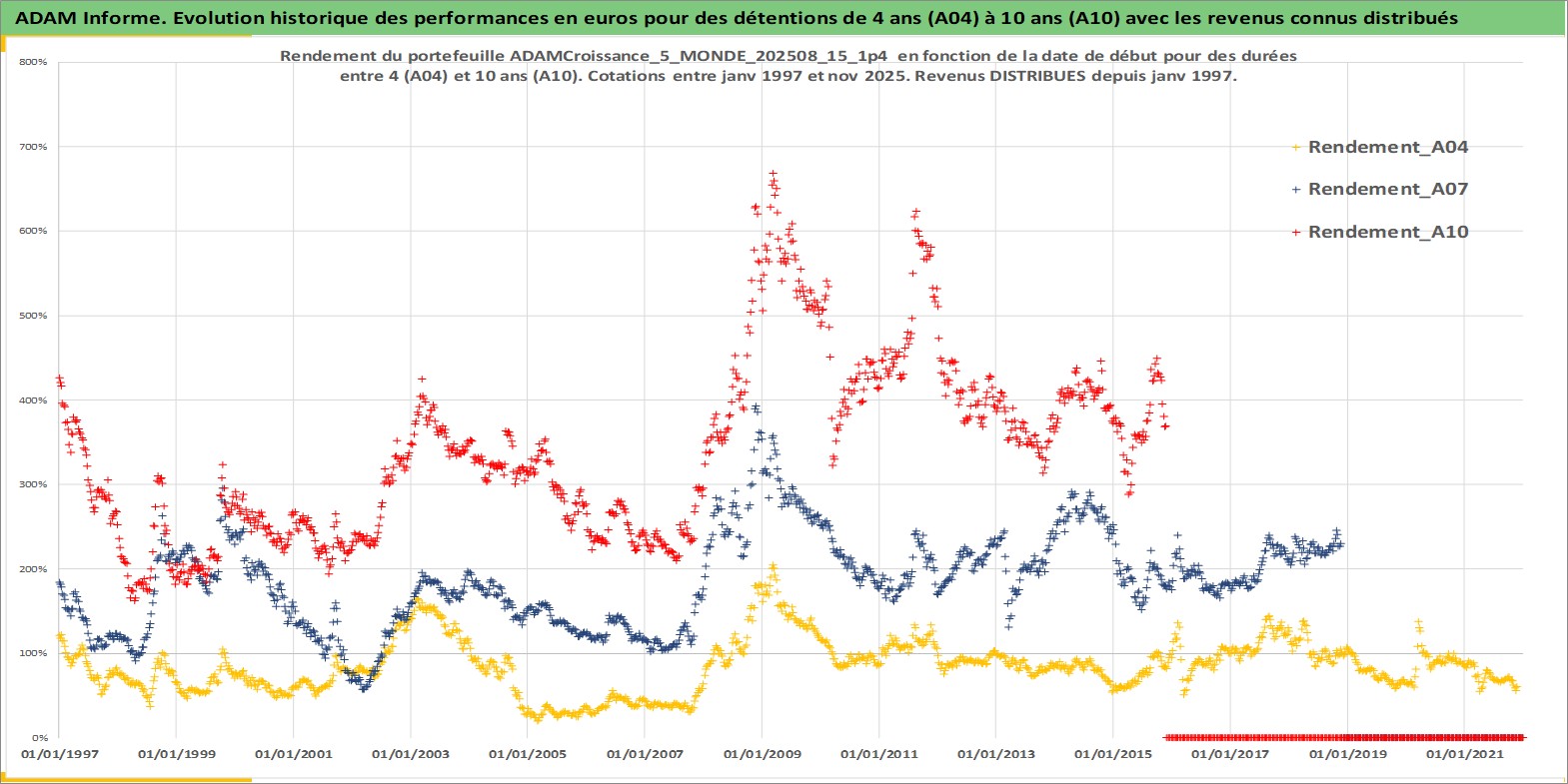 Site dédié aux investisseursPage dédiée sur site financeAnalyse des valorisations hebdomadaires du portefeuille ADAMCroissance_5_MONDE_202508_15_1p4_26actifs avec un profil P6_PurActions. Ce portefeuille est cote en EUR. Les valorisations couvrent les semaines 1997W01 a 2025W48. Les revenus de cet actif financier sont pris en compte depuis la semaine 1997W01. La note globale ESG de cet actif est estimee a 11.9 (apres rebasage entre 0 et 20).