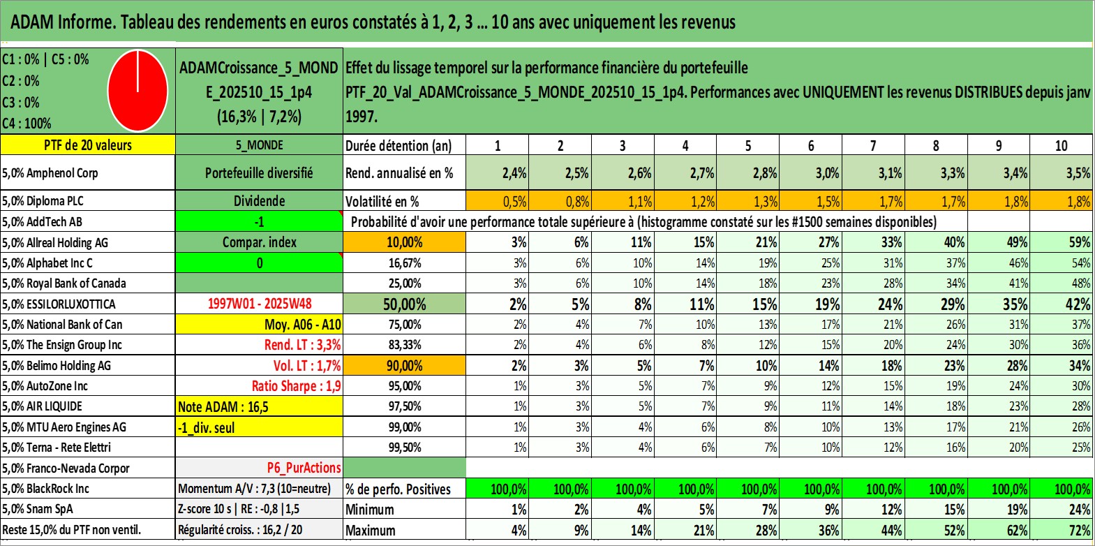 Site dédié aux investisseursPage dédiée sur site financeAnalyse des valorisations hebdomadaires du portefeuille ADAMCroissance_5_MONDE_202510_15_1p4_20actifs avec un profil P6_PurActions. Ce portefeuille est cote en EUR. Les valorisations couvrent les semaines 1997W01 a 2025W48. Les revenus de cet actif financier sont pris en compte depuis la semaine 1997W01. La note globale ESG de cet actif est estimee a 12.2 (apres rebasage entre 0 et 20).