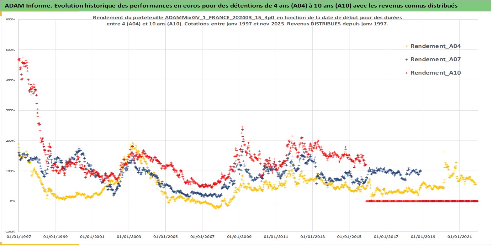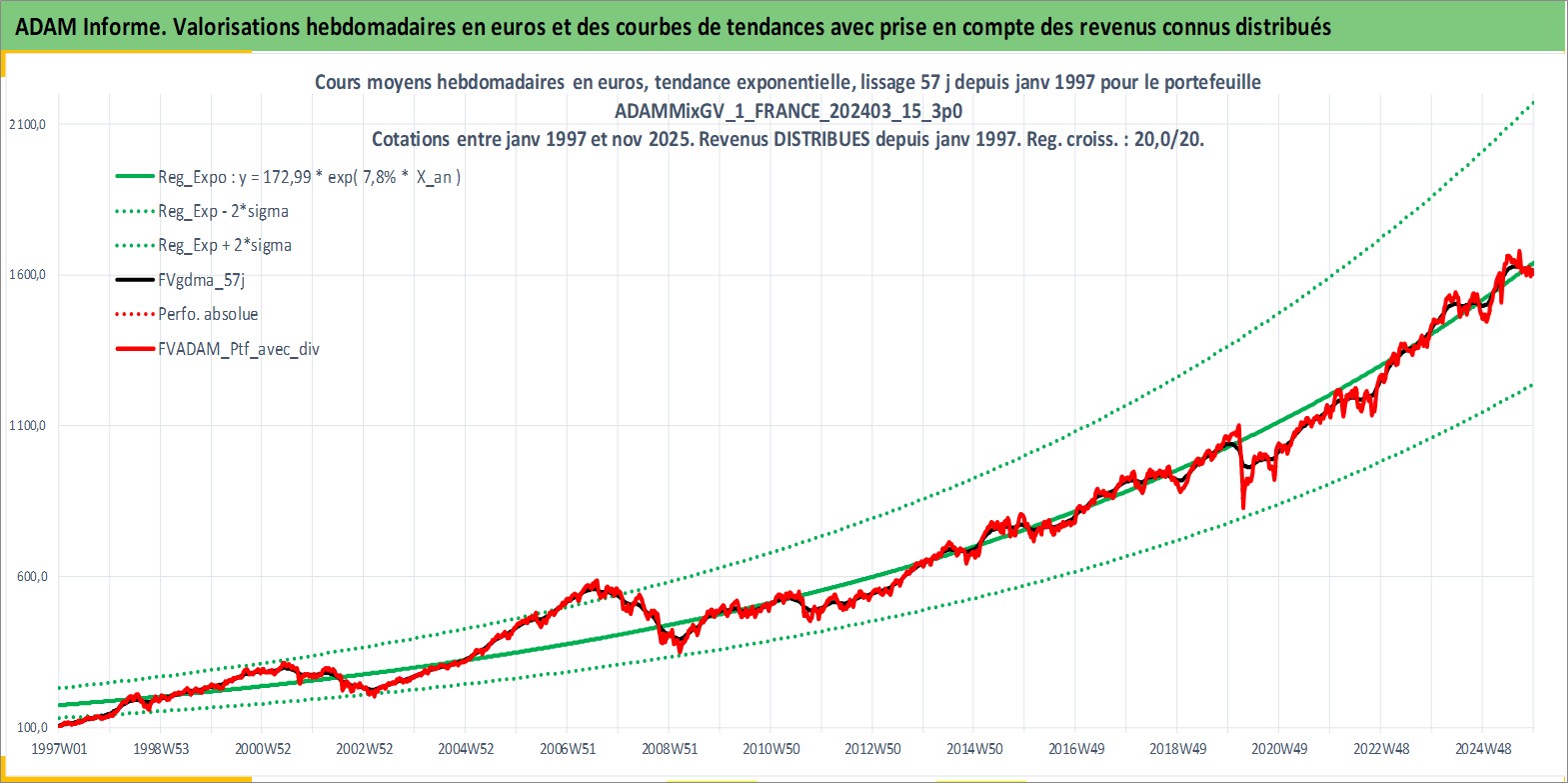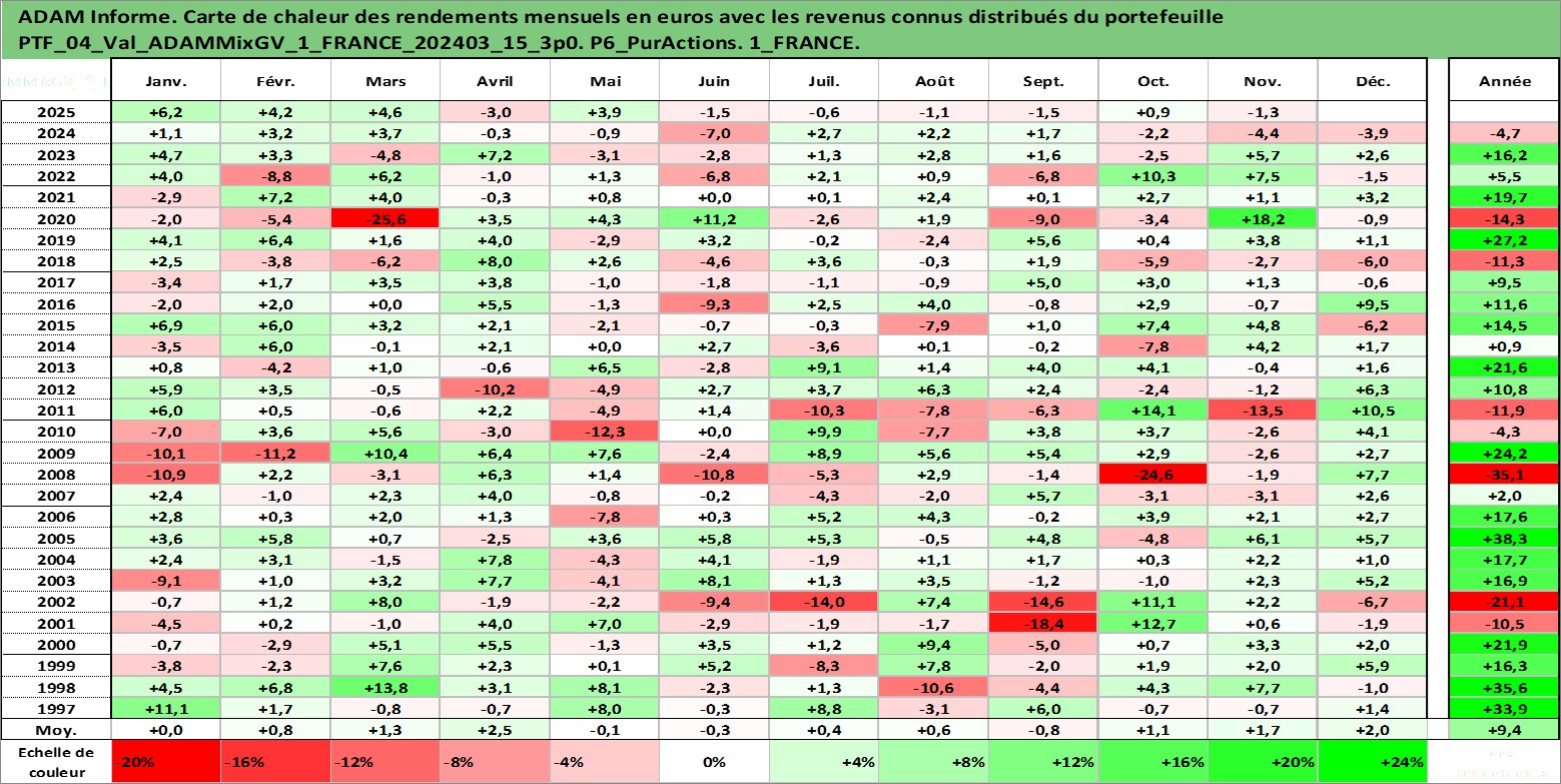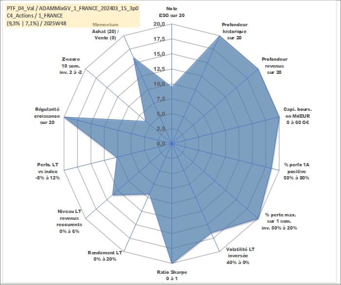 Site dédié aux investisseursPage dédiée sur site financeAnalyse des valorisations hebdomadaires du portefeuille ADAMMixGV_1_FRANCE_202403_15_3p0_4actifs avec un profil P6_PurActions. Ce portefeuille est cote en EUR. Les valorisations couvrent les semaines 1997W01 a 2025W48. Les revenus de cet actif financier sont pris en compte depuis la semaine 1997W01. La note globale ESG de cet actif est estimee a 9.5 (apres rebasage entre 0 et 20).