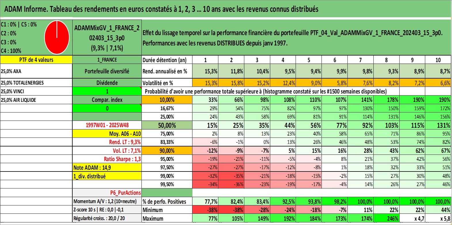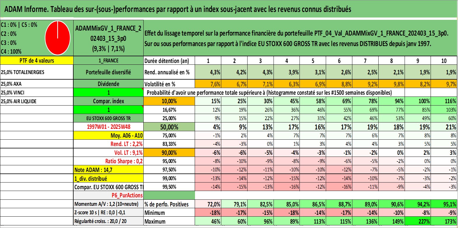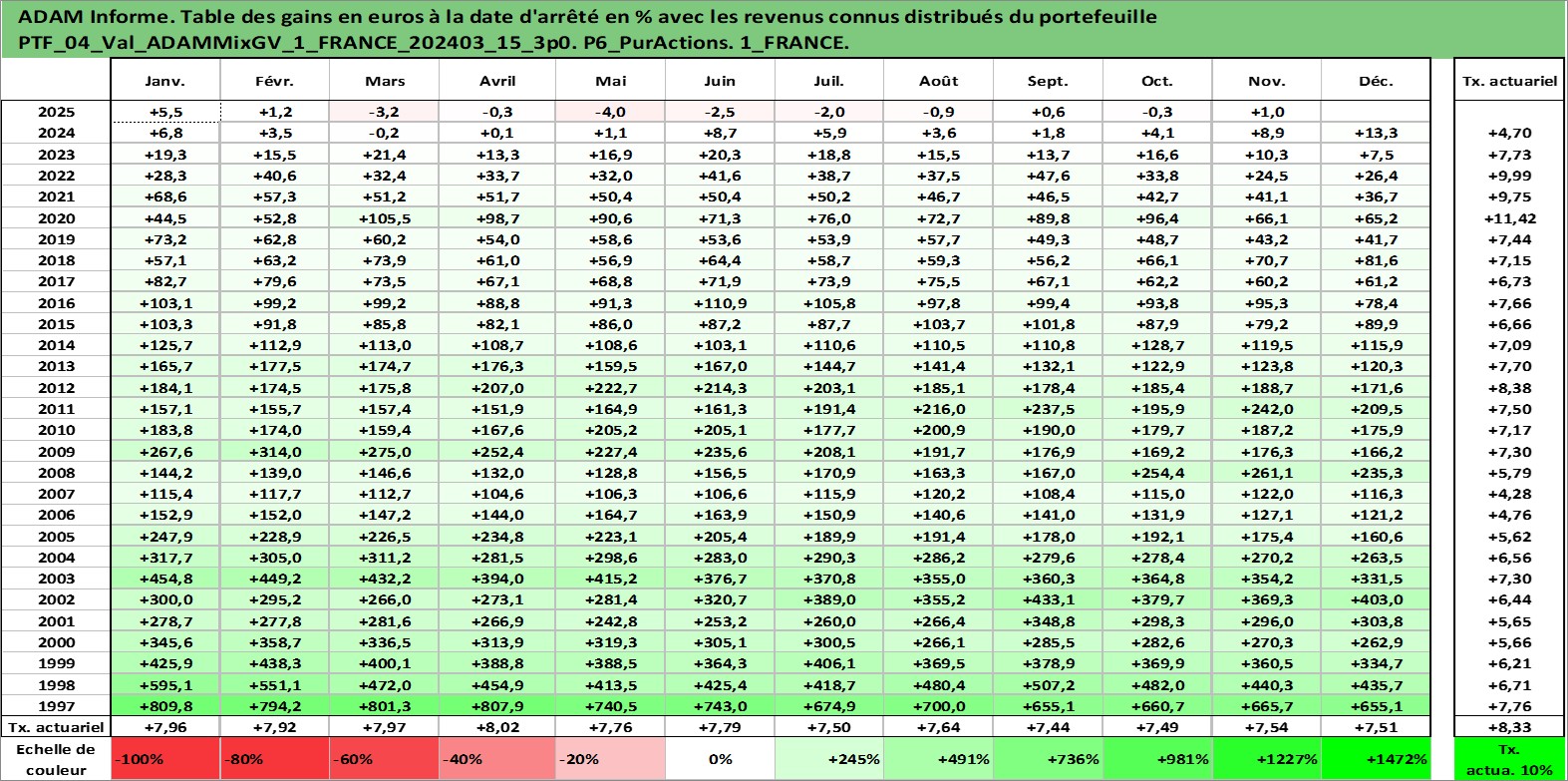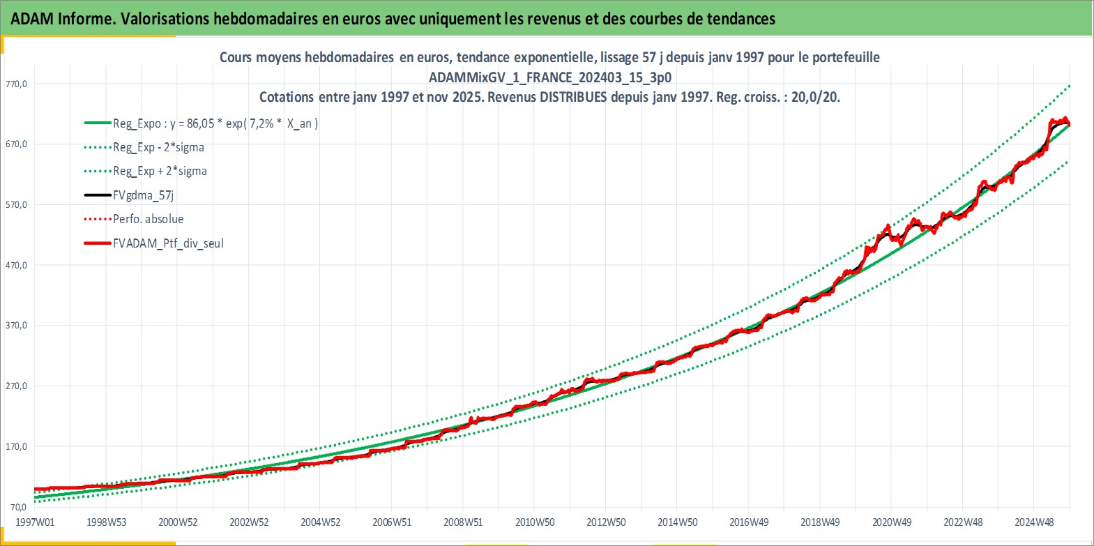 Site dédié aux investisseursPage dédiée sur site financeAnalyse des valorisations hebdomadaires du portefeuille ADAMMixGV_1_FRANCE_202403_15_3p0_4actifs avec un profil P6_PurActions. Ce portefeuille est cote en EUR. Les valorisations couvrent les semaines 1997W01 a 2025W48. Les revenus de cet actif financier sont pris en compte depuis la semaine 1997W01. La note globale ESG de cet actif est estimee a 9.5 (apres rebasage entre 0 et 20).