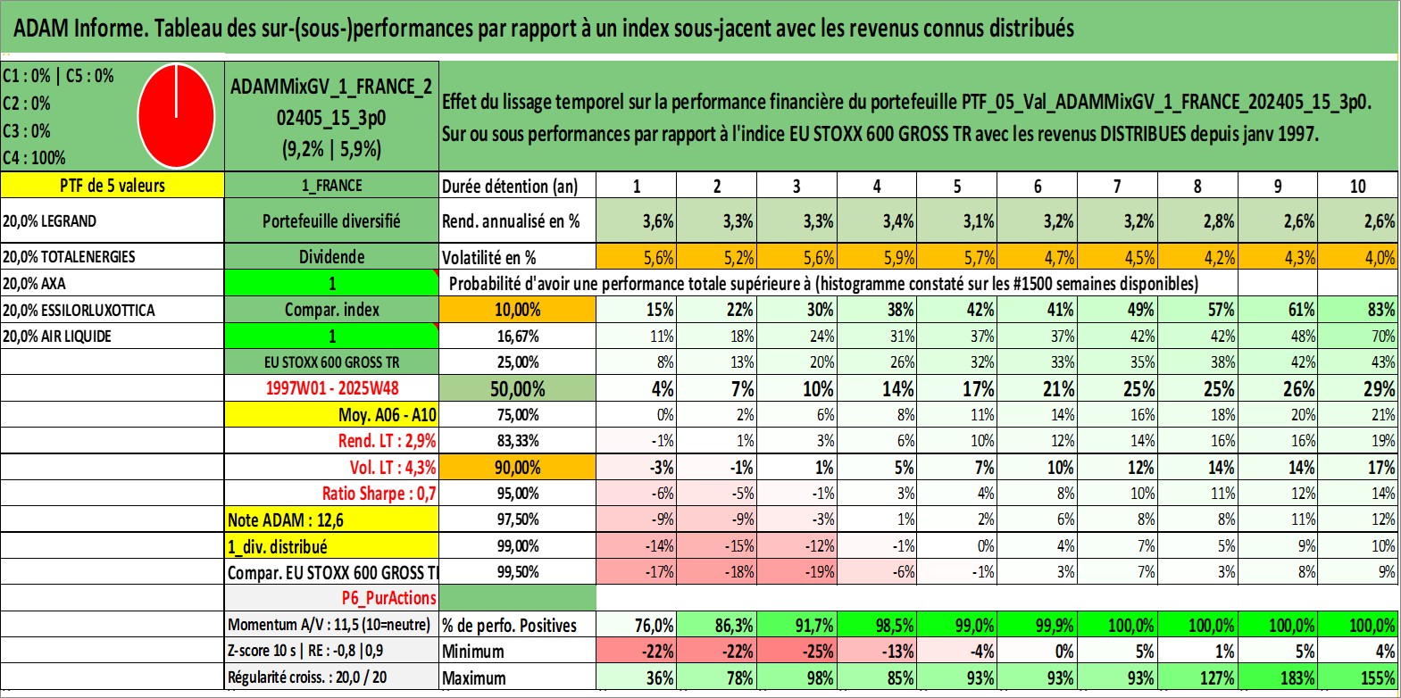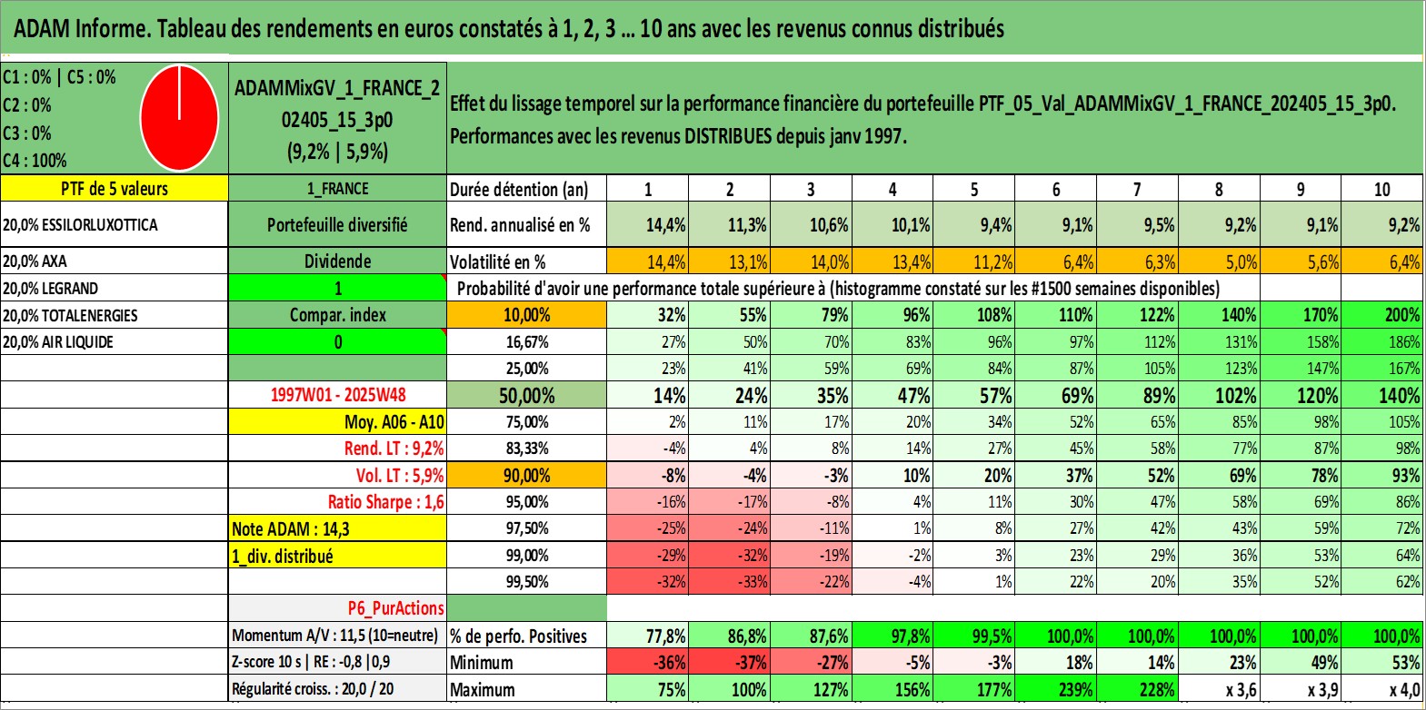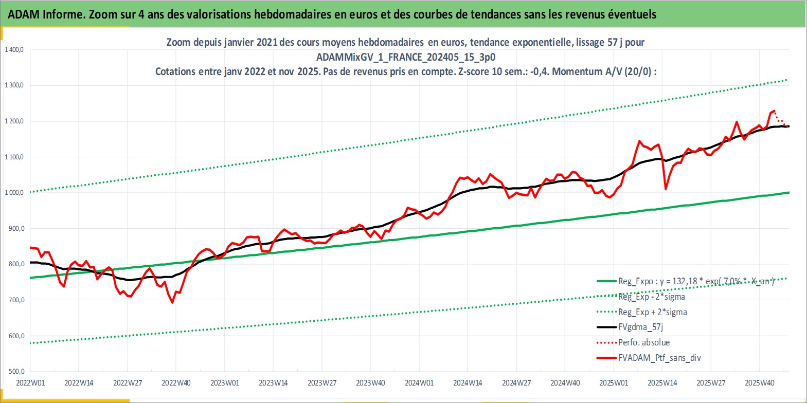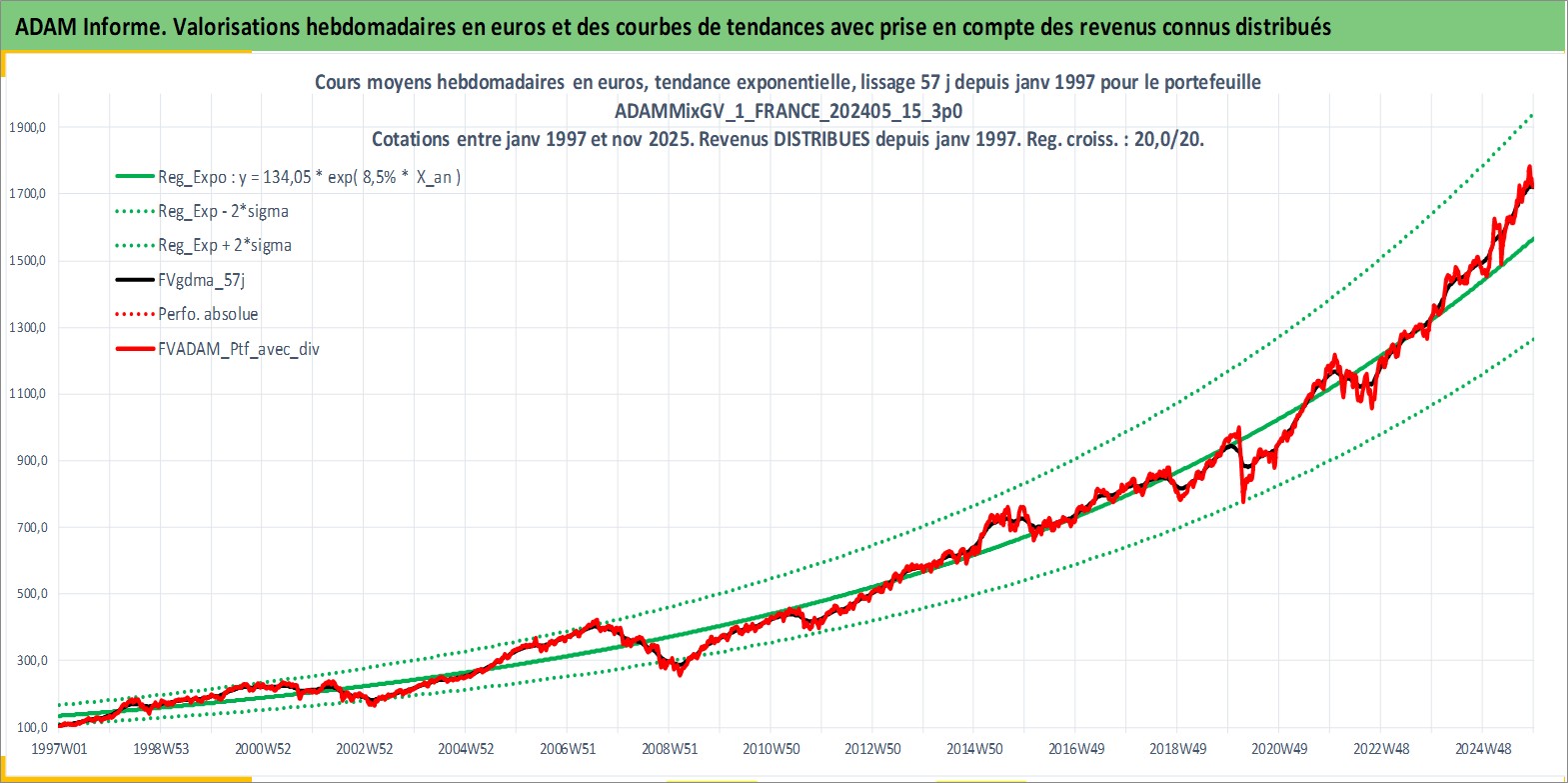 Site dédié aux investisseursPage dédiée sur site financeAnalyse des valorisations hebdomadaires du portefeuille ADAMMixGV_1_FRANCE_202405_15_3p0_5actifs avec un profil P6_PurActions. Ce portefeuille est cote en EUR. Les valorisations couvrent les semaines 1997W01 a 2025W48. Les revenus de cet actif financier sont pris en compte depuis la semaine 1997W01. La note globale ESG de cet actif est estimee a 10.8 (apres rebasage entre 0 et 20).