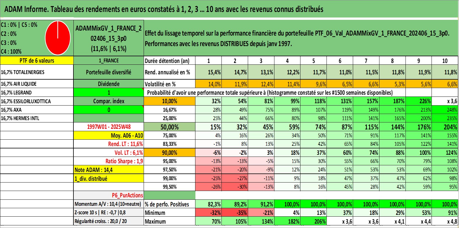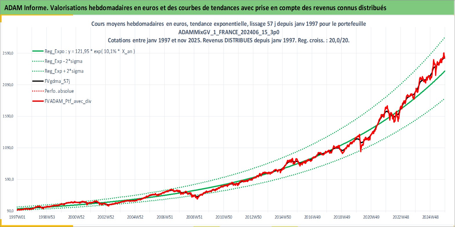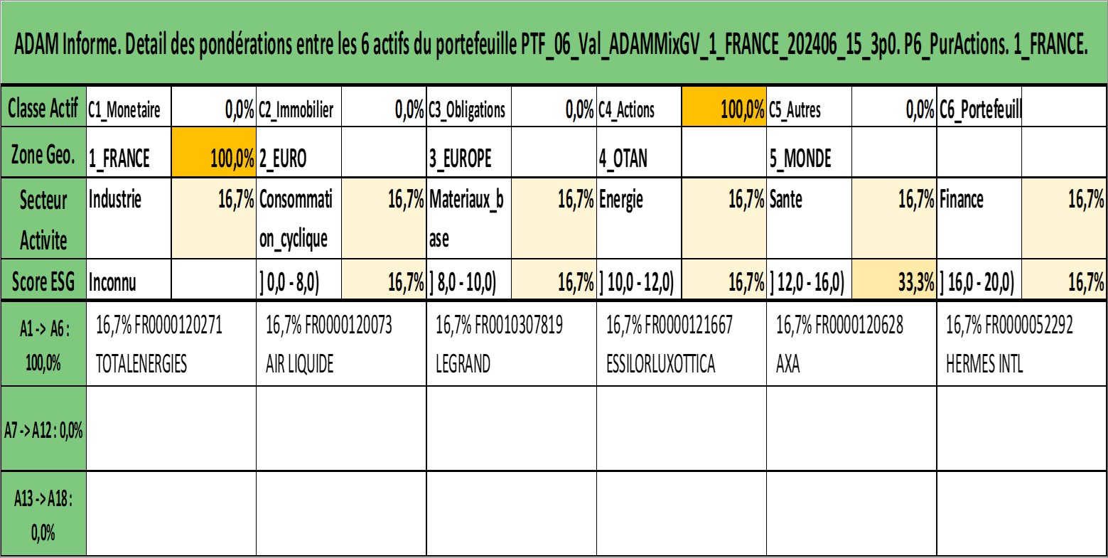 Site dédié aux investisseursPage dédiée sur site financeAnalyse des valorisations hebdomadaires du portefeuille ADAMMixGV_1_FRANCE_202406_15_3p0_6actifs avec un profil P6_PurActions. Ce portefeuille est cote en EUR. Les valorisations couvrent les semaines 1997W01 a 2025W48. Les revenus de cet actif financier sont pris en compte depuis la semaine 1997W01. La note globale ESG de cet actif est estimee a 11.8 (apres rebasage entre 0 et 20).