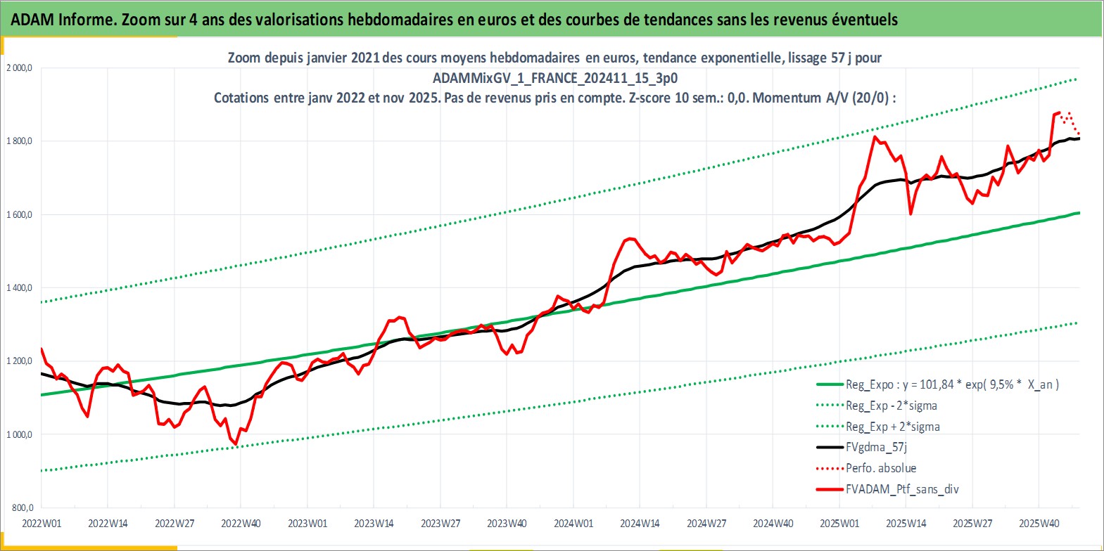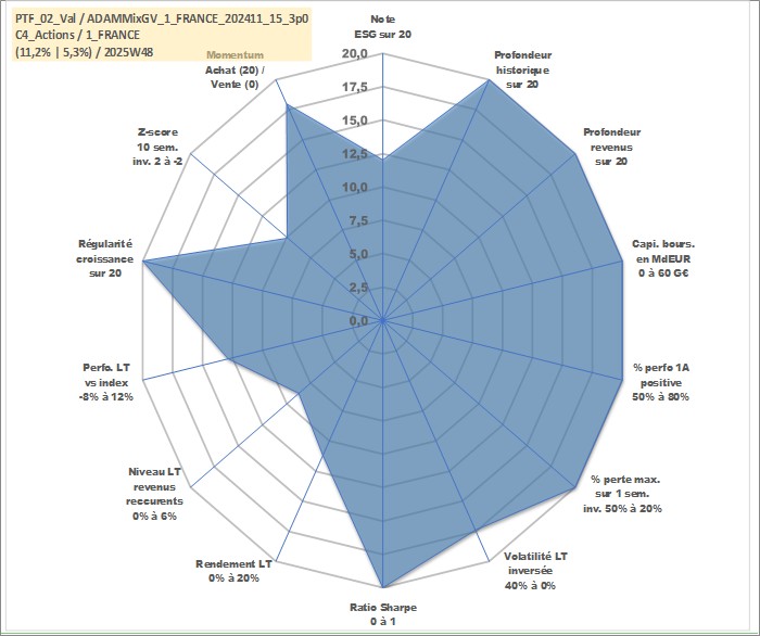 Site dédié aux investisseursPage dédiée sur site financeAnalyse des valorisations hebdomadaires du portefeuille ADAMMixGV_1_FRANCE_202411_15_3p0_2actifs avec un profil P6_PurActions. Ce portefeuille est cote en EUR. Les valorisations couvrent les semaines 1997W01 a 2025W48. Les revenus de cet actif financier sont pris en compte depuis la semaine 1997W01. La note globale ESG de cet actif est estimee a 12.0 (apres rebasage entre 0 et 20).