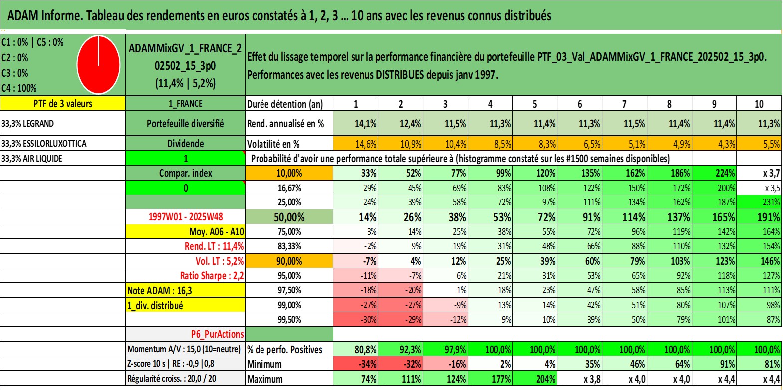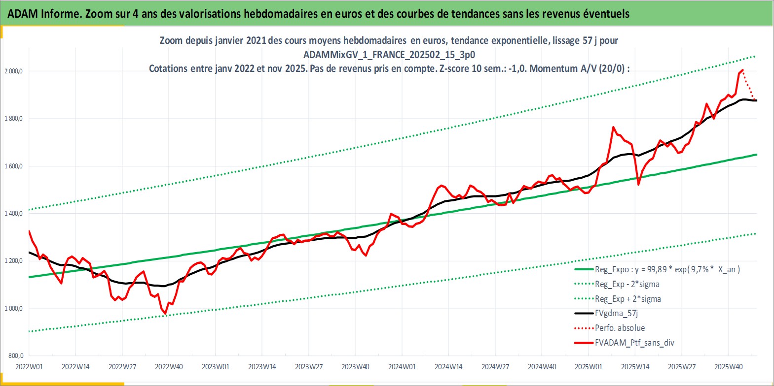 Site dédié aux investisseursPage dédiée sur site financeAnalyse des valorisations hebdomadaires du portefeuille ADAMMixGV_1_FRANCE_202502_15_3p0_3actifs avec un profil P6_PurActions. Ce portefeuille est cote en EUR. Les valorisations couvrent les semaines 1997W01 a 2025W48. Les revenus de cet actif financier sont pris en compte depuis la semaine 1997W01. La note globale ESG de cet actif est estimee a 12.3 (apres rebasage entre 0 et 20).