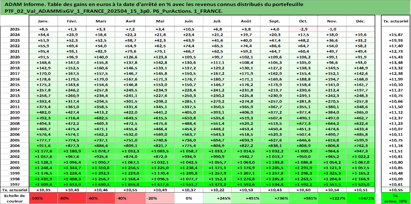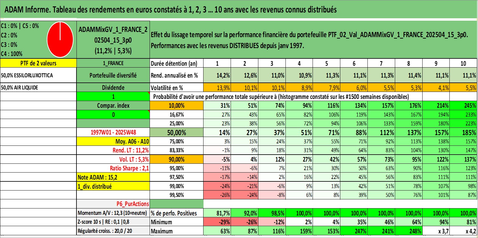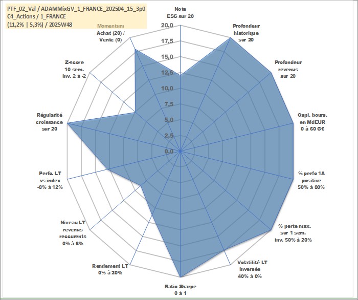Site dédié aux investisseursPage dédiée sur site financeAnalyse des valorisations hebdomadaires du portefeuille ADAMMixGV_1_FRANCE_202504_15_3p0_2actifs avec un profil P6_PurActions. Ce portefeuille est cote en EUR. Les valorisations couvrent les semaines 1997W01 a 2025W48. Les revenus de cet actif financier sont pris en compte depuis la semaine 1997W01. La note globale ESG de cet actif est estimee a 12.0 (apres rebasage entre 0 et 20).