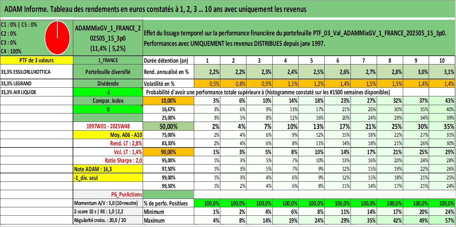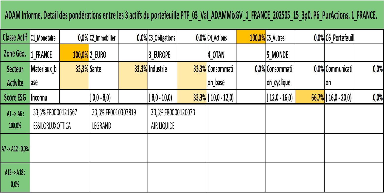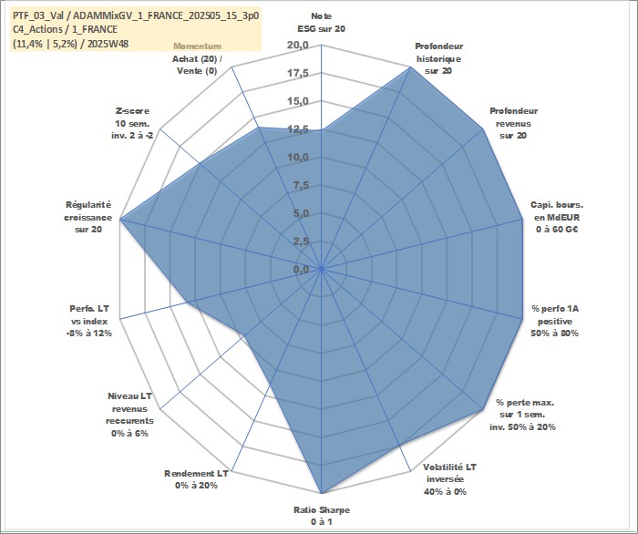 Site dédié aux investisseursPage dédiée sur site financeAnalyse des valorisations hebdomadaires du portefeuille ADAMMixGV_1_FRANCE_202505_15_3p0_3actifs avec un profil P6_PurActions. Ce portefeuille est cote en EUR. Les valorisations couvrent les semaines 1997W01 a 2025W48. Les revenus de cet actif financier sont pris en compte depuis la semaine 1997W01. La note globale ESG de cet actif est estimee a 12.3 (apres rebasage entre 0 et 20).