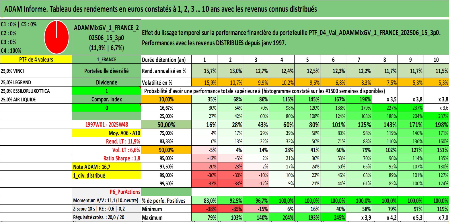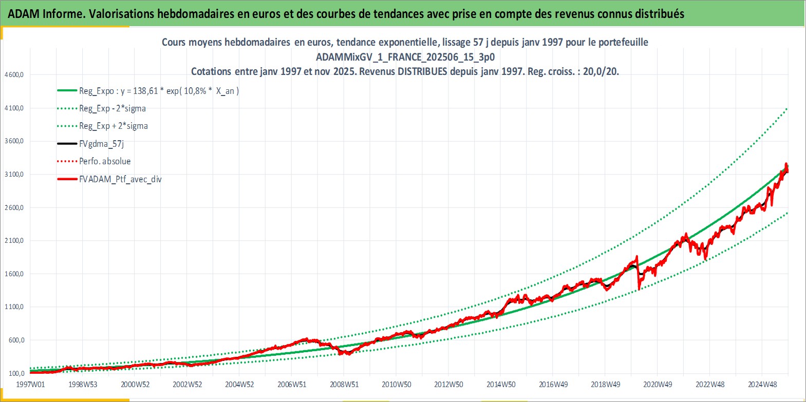 Site dédié aux investisseursPage dédiée sur site financeAnalyse des valorisations hebdomadaires du portefeuille ADAMMixGV_1_FRANCE_202506_15_3p0_4actifs avec un profil P6_PurActions. Ce portefeuille est cote en EUR. Les valorisations couvrent les semaines 1997W01 a 2025W48. Les revenus de cet actif financier sont pris en compte depuis la semaine 1997W01. La note globale ESG de cet actif est estimee a 11.0 (apres rebasage entre 0 et 20).