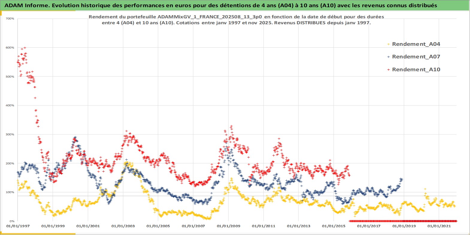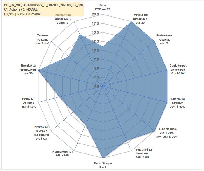 Site dédié aux investisseursPage dédiée sur site financeAnalyse des valorisations hebdomadaires du portefeuille ADAMMixGV_1_FRANCE_202508_13_3p0_4actifs avec un profil P6_PurActions. Ce portefeuille est cote en EUR. Les valorisations couvrent les semaines 1997W01 a 2025W48. Les revenus de cet actif financier sont pris en compte depuis la semaine 1997W01. La note globale ESG de cet actif est estimee a 11.0 (apres rebasage entre 0 et 20).