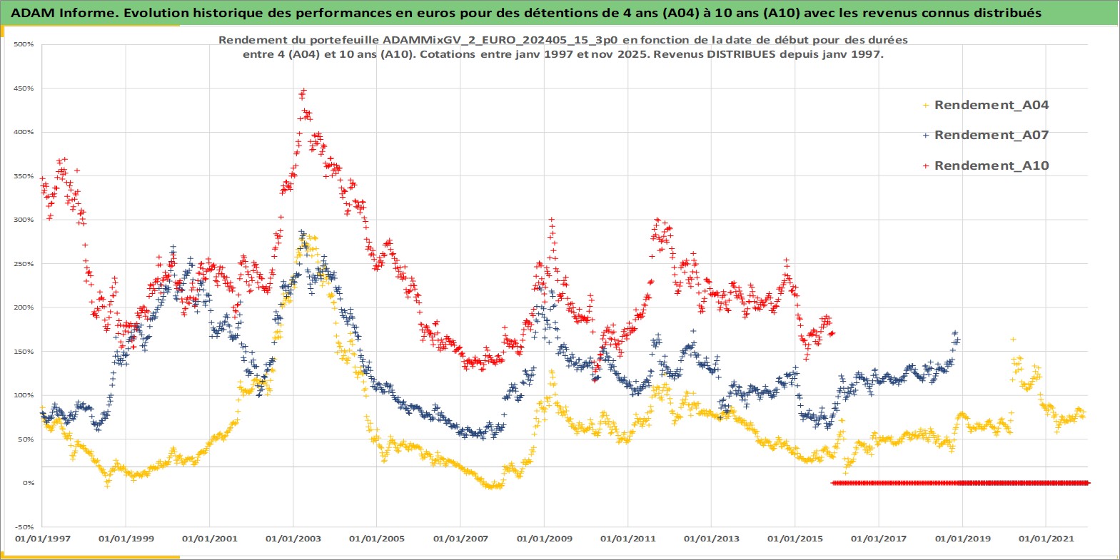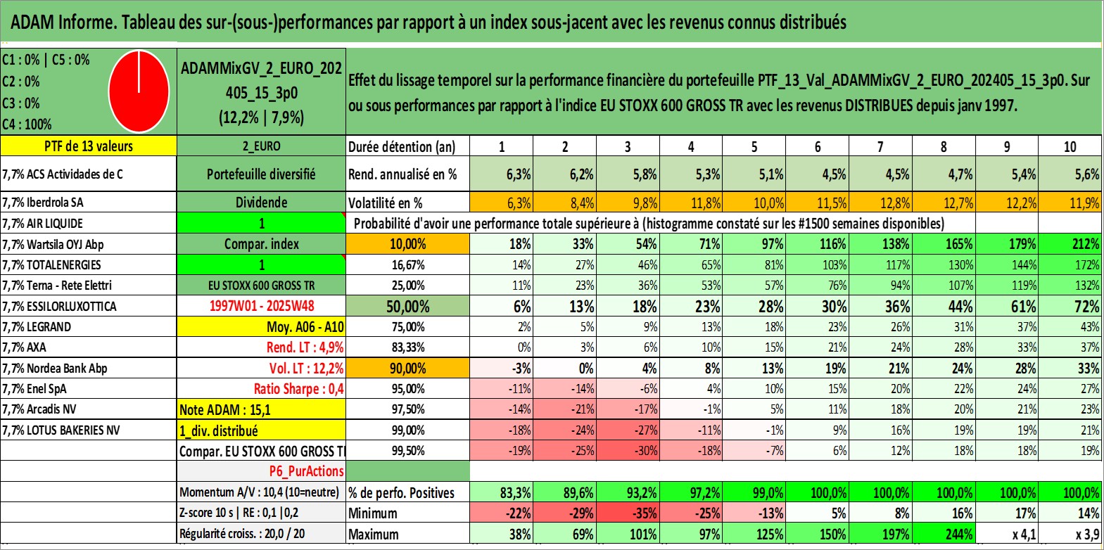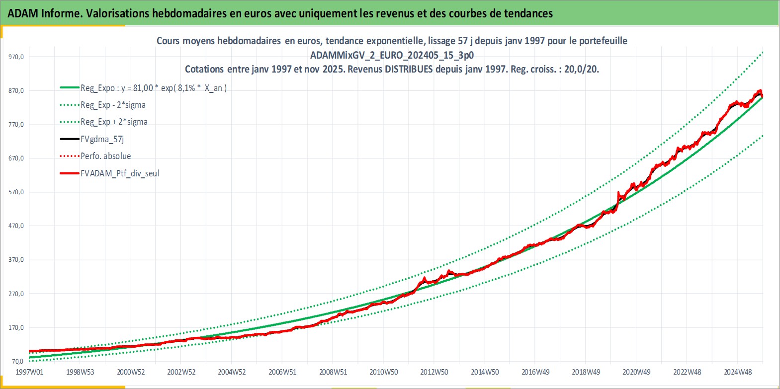 Site dédié aux investisseursPage dédiée sur site financeAnalyse des valorisations hebdomadaires du portefeuille ADAMMixGV_2_EURO_202405_15_3p0_13actifs avec un profil P6_PurActions. Ce portefeuille est cote en EUR. Les valorisations couvrent les semaines 1997W01 a 2025W48. Les revenus de cet actif financier sont pris en compte depuis la semaine 1997W01. La note globale ESG de cet actif est estimee a 10.6 (apres rebasage entre 0 et 20).