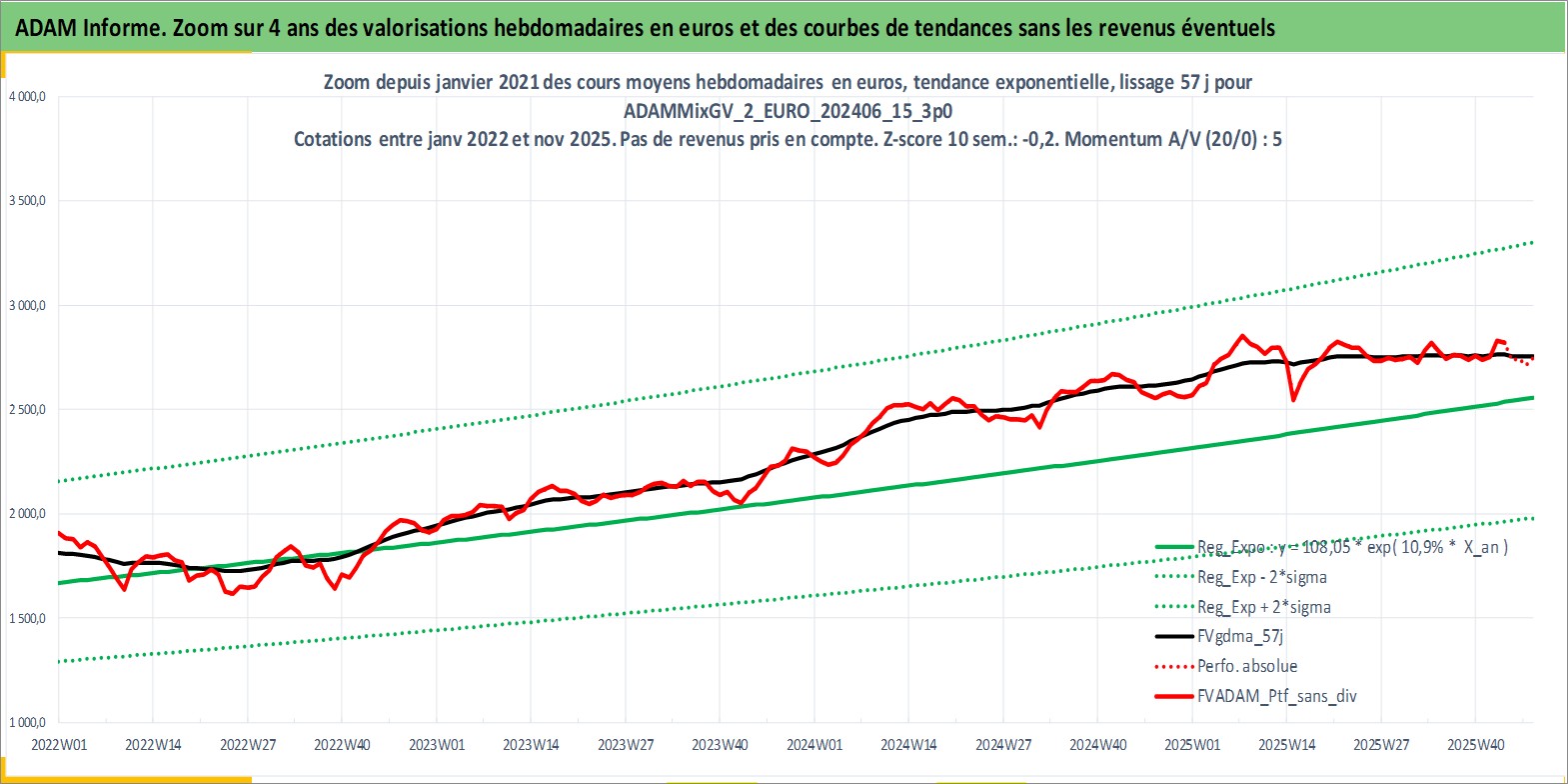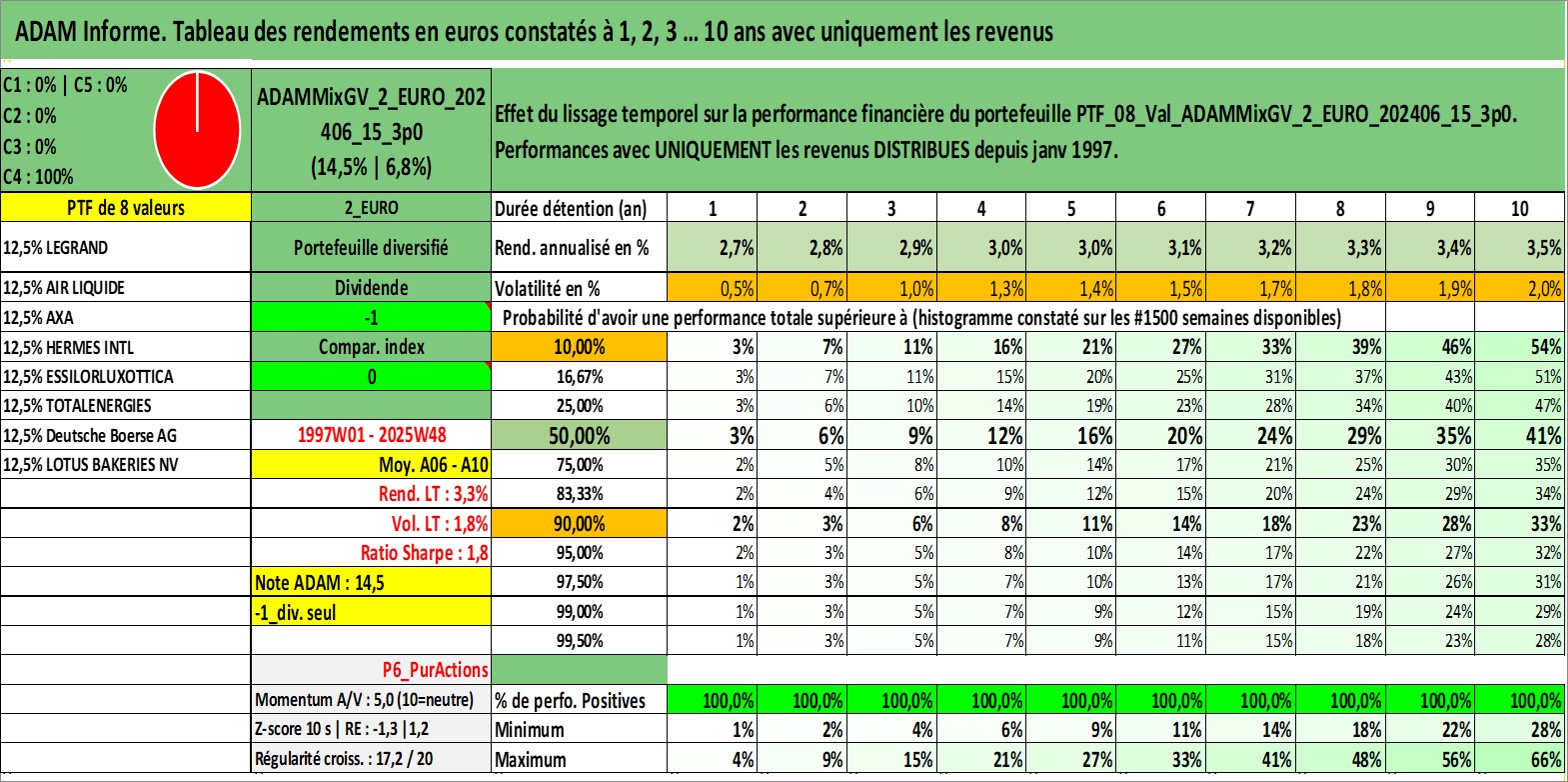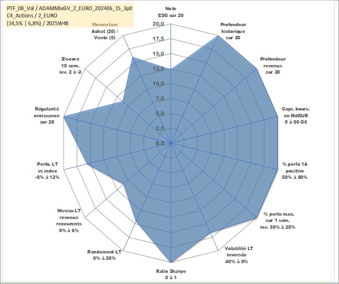 Site dédié aux investisseursPage dédiée sur site financeAnalyse des valorisations hebdomadaires du portefeuille ADAMMixGV_2_EURO_202406_15_3p0_8actifs avec un profil P6_PurActions. Ce portefeuille est cote en EUR. Les valorisations couvrent les semaines 1997W01 a 2025W48. Les revenus de cet actif financier sont pris en compte depuis la semaine 1997W01. La note globale ESG de cet actif est estimee a 12.3 (apres rebasage entre 0 et 20).