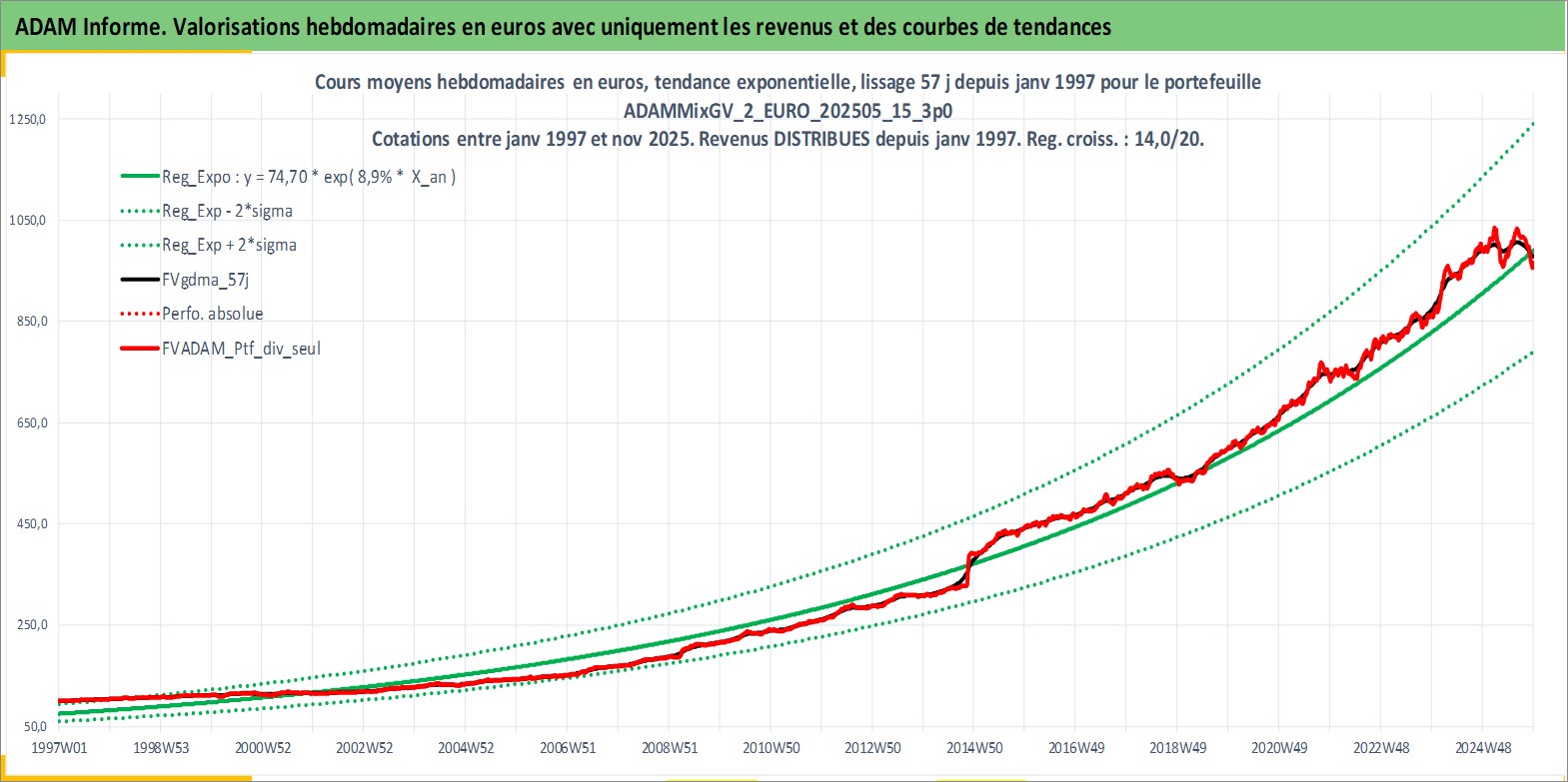 Site dédié aux investisseursPage dédiée sur site financeAnalyse des valorisations hebdomadaires du portefeuille ADAMMixGV_2_EURO_202505_15_3p0_13actifs avec un profil P6_PurActions. Ce portefeuille est cote en EUR. Les valorisations couvrent les semaines 1997W01 a 2025W48. Les revenus de cet actif financier sont pris en compte depuis la semaine 1997W01. La note globale ESG de cet actif est estimee a 11.7 (apres rebasage entre 0 et 20).
