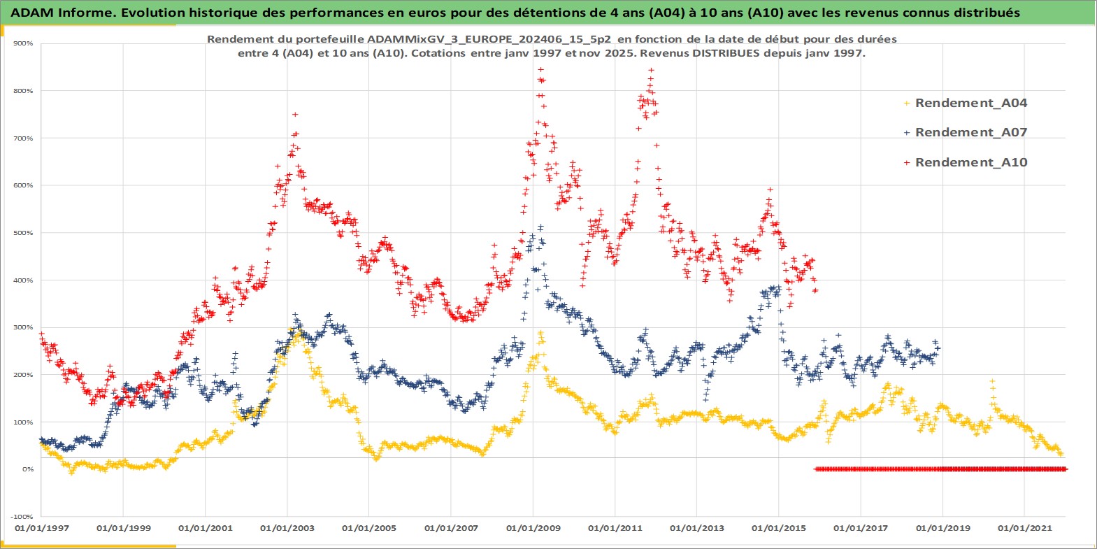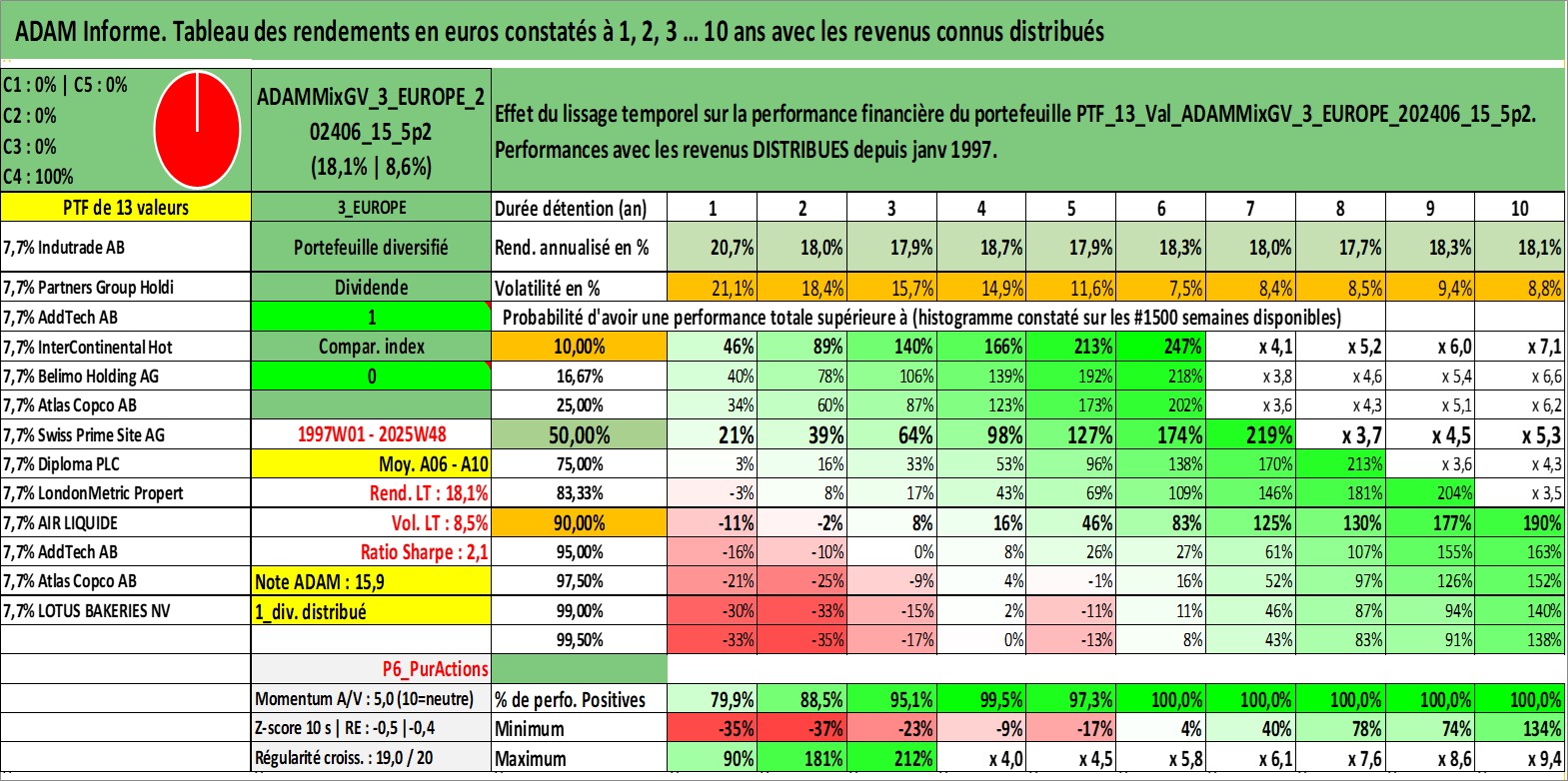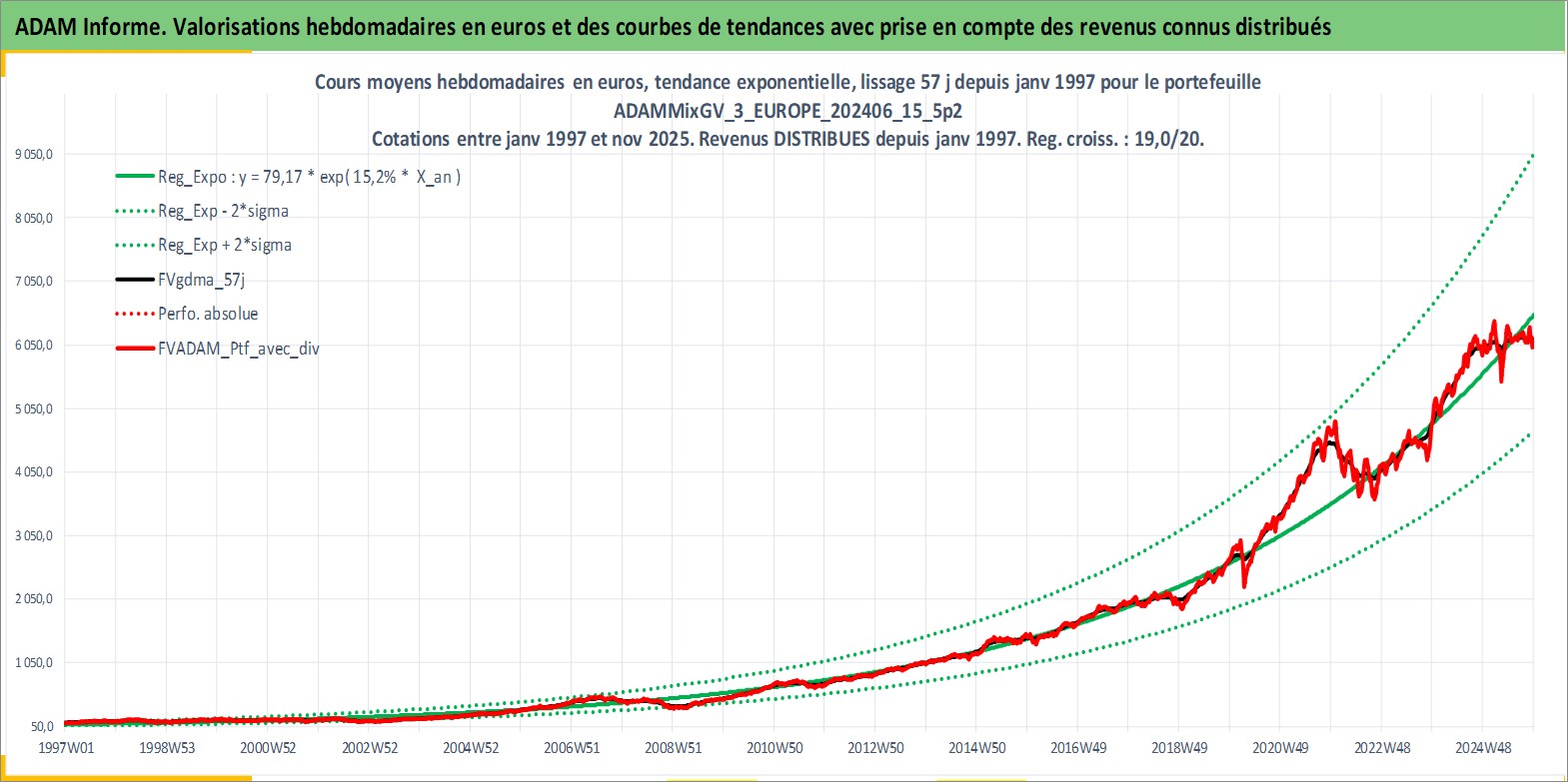 Site dédié aux investisseursPage dédiée sur site financeAnalyse des valorisations hebdomadaires du portefeuille ADAMMixGV_3_EUROPE_202406_15_5p2_13actifs avec un profil P6_PurActions. Ce portefeuille est cote en EUR. Les valorisations couvrent les semaines 1997W01 a 2025W48. Les revenus de cet actif financier sont pris en compte depuis la semaine 1997W01. La note globale ESG de cet actif est estimee a 12.2 (apres rebasage entre 0 et 20).