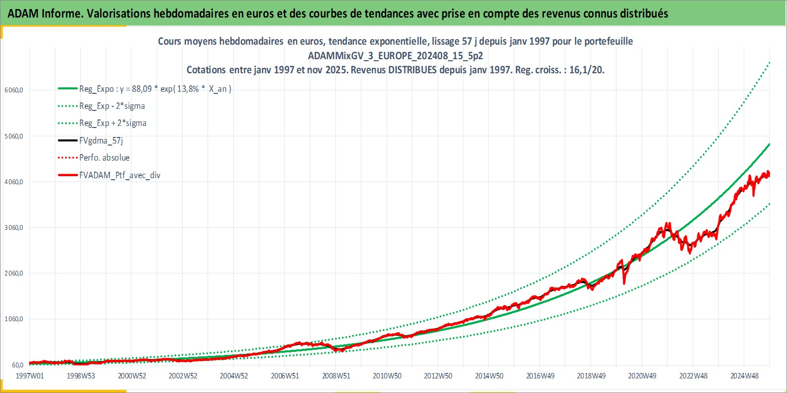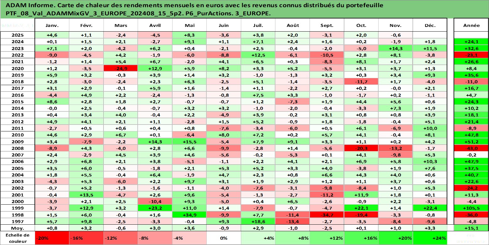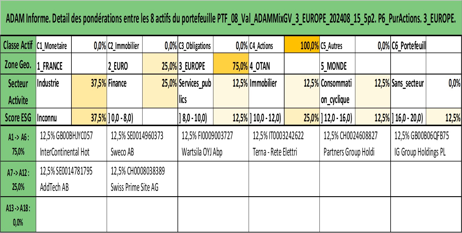 Site dédié aux investisseursPage dédiée sur site financeAnalyse des valorisations hebdomadaires du portefeuille ADAMMixGV_3_EUROPE_202408_15_5p2_8actifs avec un profil P6_PurActions. Ce portefeuille est cote en EUR. Les valorisations couvrent les semaines 1997W01 a 2025W48. Les revenus de cet actif financier sont pris en compte depuis la semaine 1997W01. La note globale ESG de cet actif est estimee a 13.0 (apres rebasage entre 0 et 20).