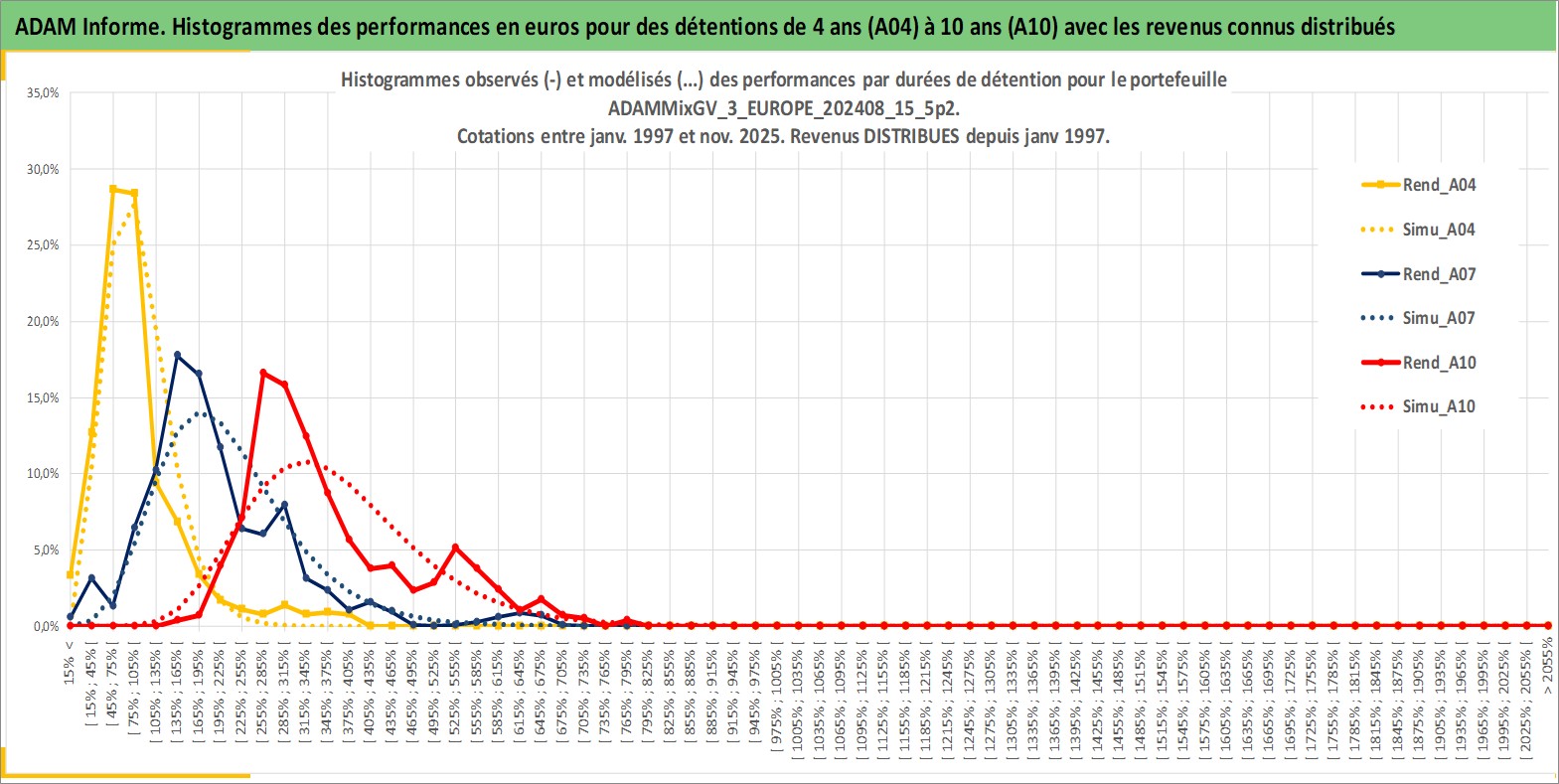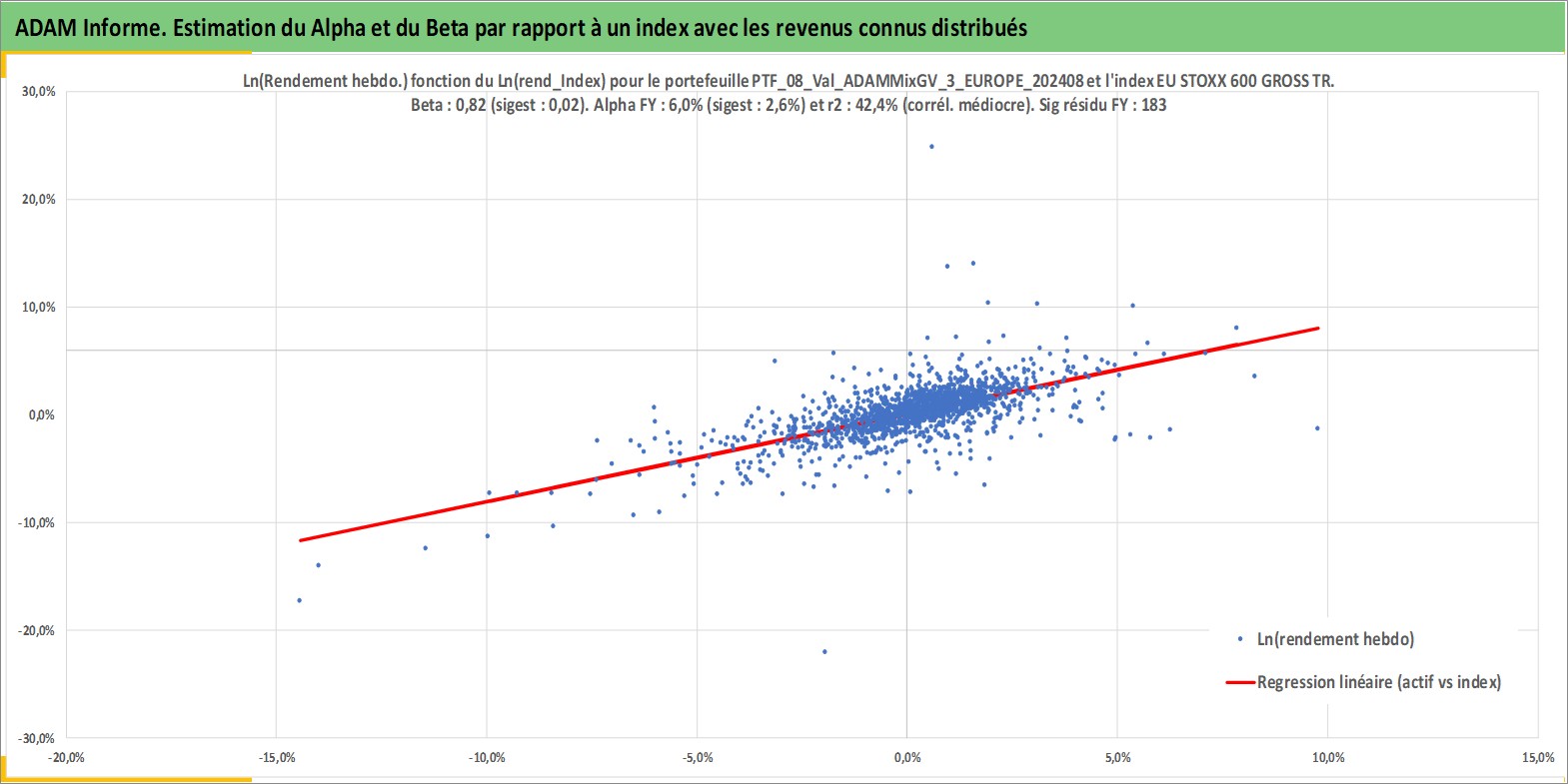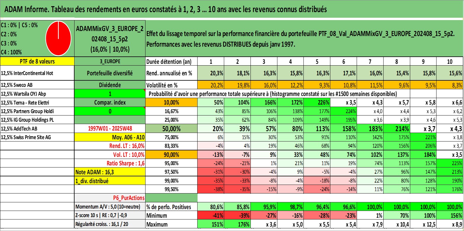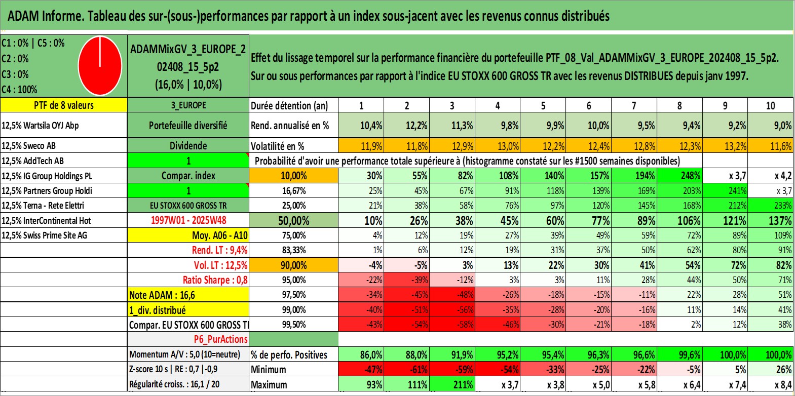 Site dédié aux investisseursPage dédiée sur site financeAnalyse des valorisations hebdomadaires du portefeuille ADAMMixGV_3_EUROPE_202408_15_5p2_8actifs avec un profil P6_PurActions. Ce portefeuille est cote en EUR. Les valorisations couvrent les semaines 1997W01 a 2025W48. Les revenus de cet actif financier sont pris en compte depuis la semaine 1997W01. La note globale ESG de cet actif est estimee a 13.0 (apres rebasage entre 0 et 20).