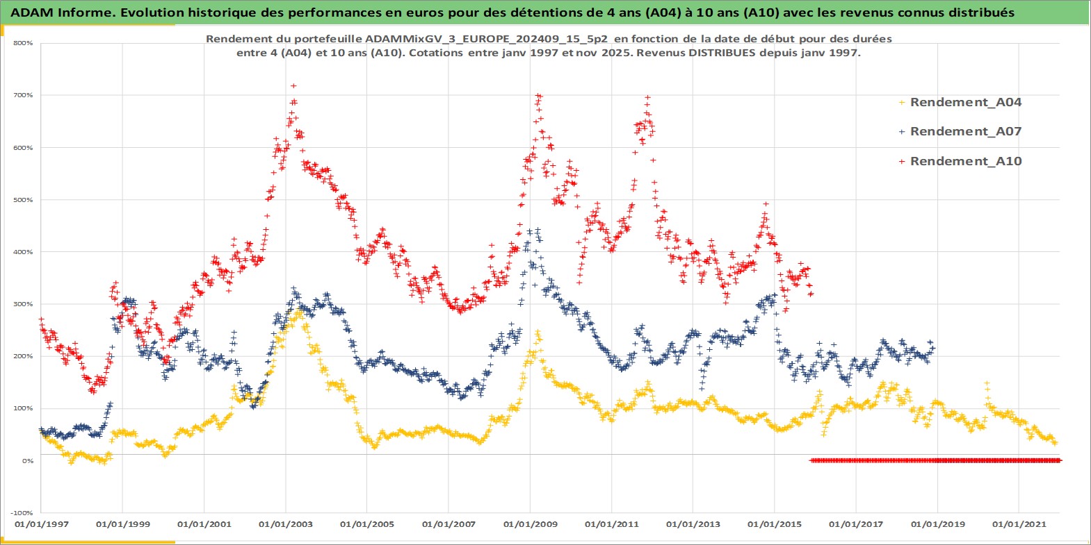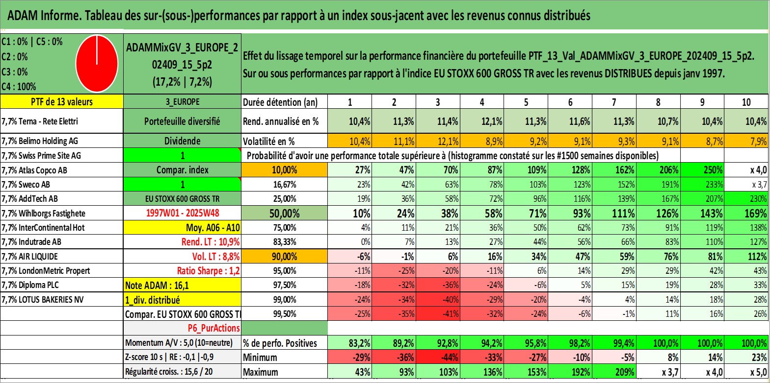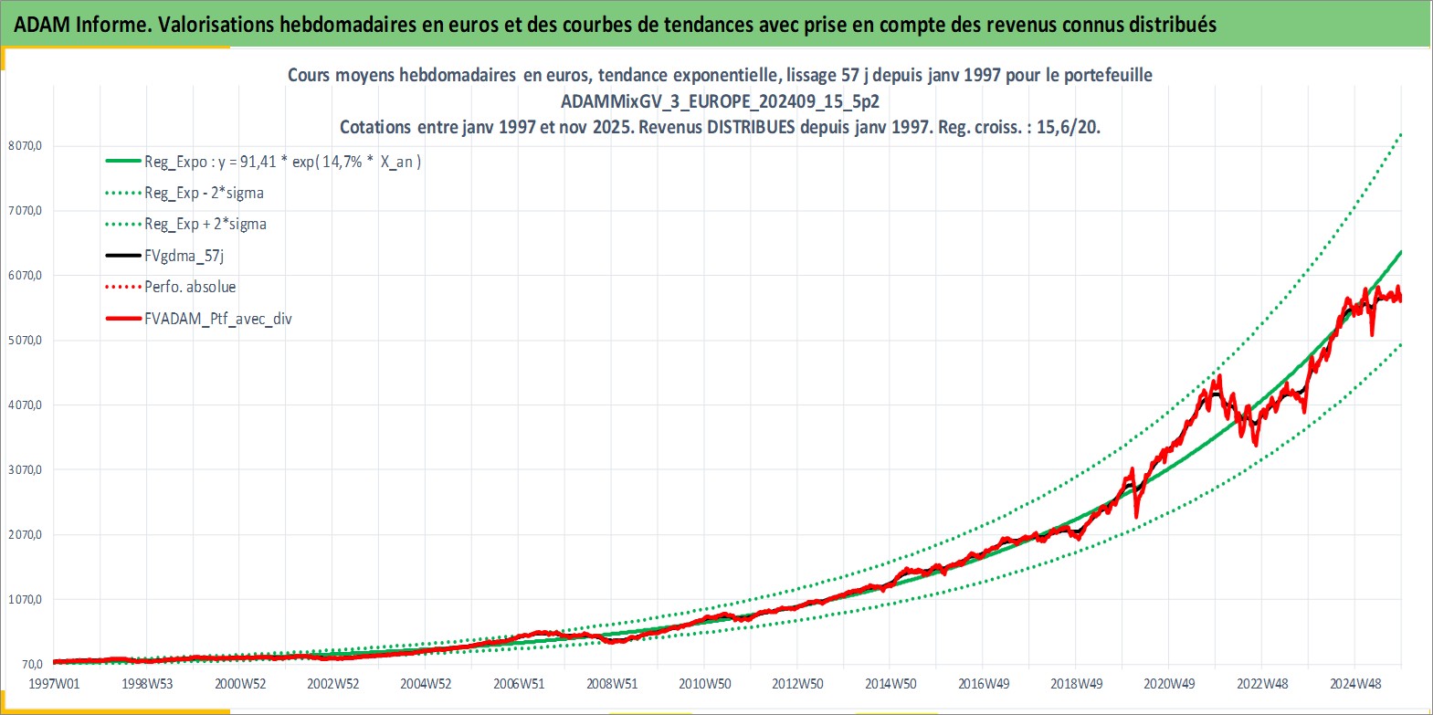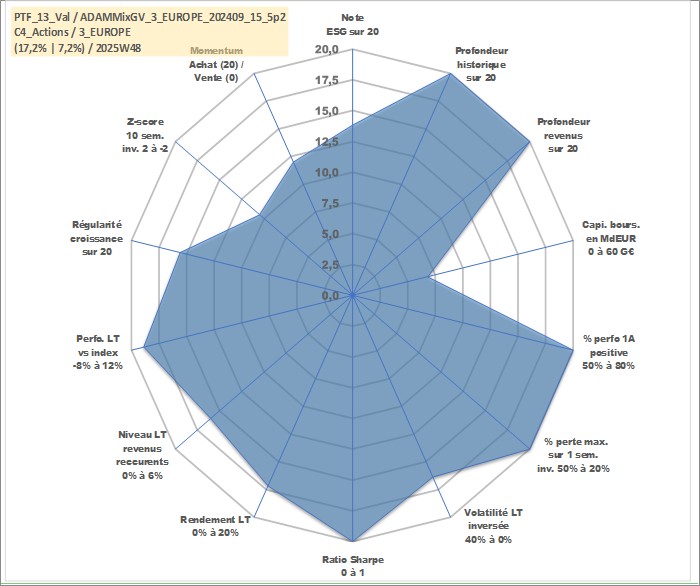 Site dédié aux investisseursPage dédiée sur site financeAnalyse des valorisations hebdomadaires du portefeuille ADAMMixGV_3_EUROPE_202409_15_5p2_13actifs avec un profil P6_PurActions. Ce portefeuille est cote en EUR. Les valorisations couvrent les semaines 1997W01 a 2025W48. Les revenus de cet actif financier sont pris en compte depuis la semaine 1997W01. La note globale ESG de cet actif est estimee a 13.8 (apres rebasage entre 0 et 20).