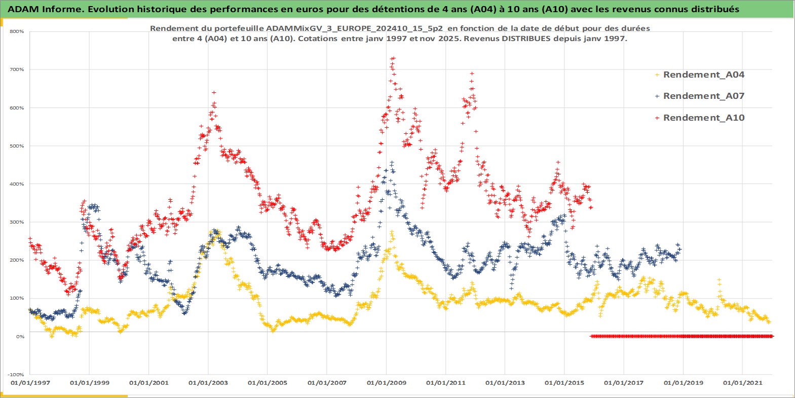 Site dédié aux investisseursPage dédiée sur site financeAnalyse des valorisations hebdomadaires du portefeuille ADAMMixGV_3_EUROPE_202410_15_5p2_11actifs avec un profil P6_PurActions. Ce portefeuille est cote en EUR. Les valorisations couvrent les semaines 1997W01 a 2025W48. Les revenus de cet actif financier sont pris en compte depuis la semaine 1997W01. La note globale ESG de cet actif est estimee a 13.8 (apres rebasage entre 0 et 20).