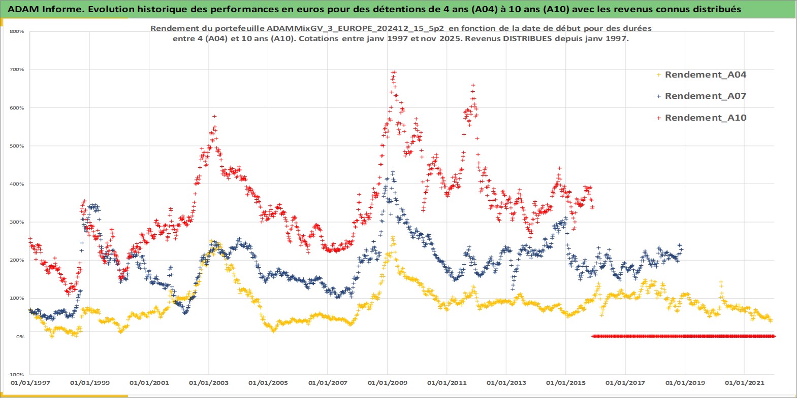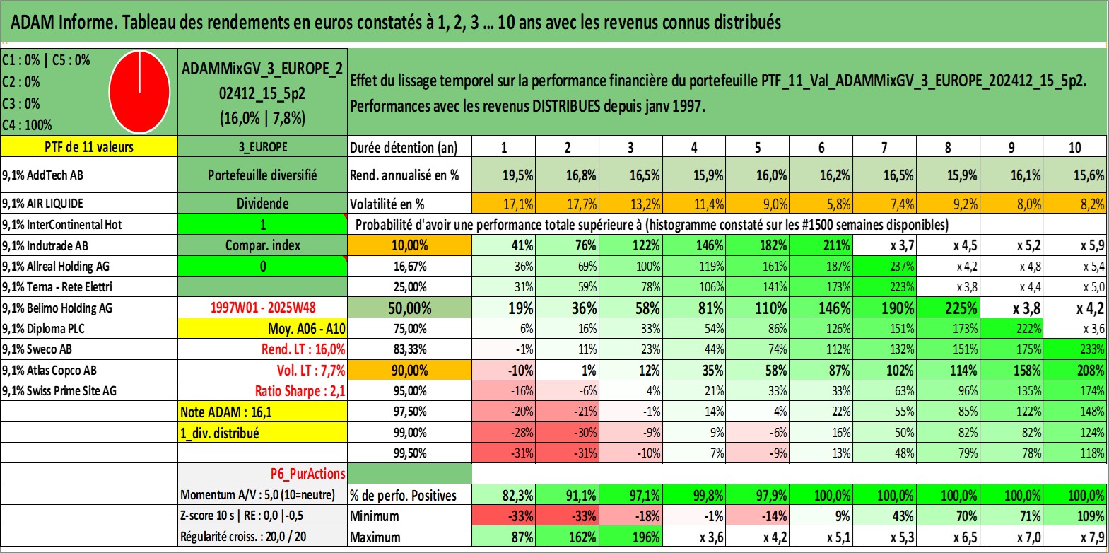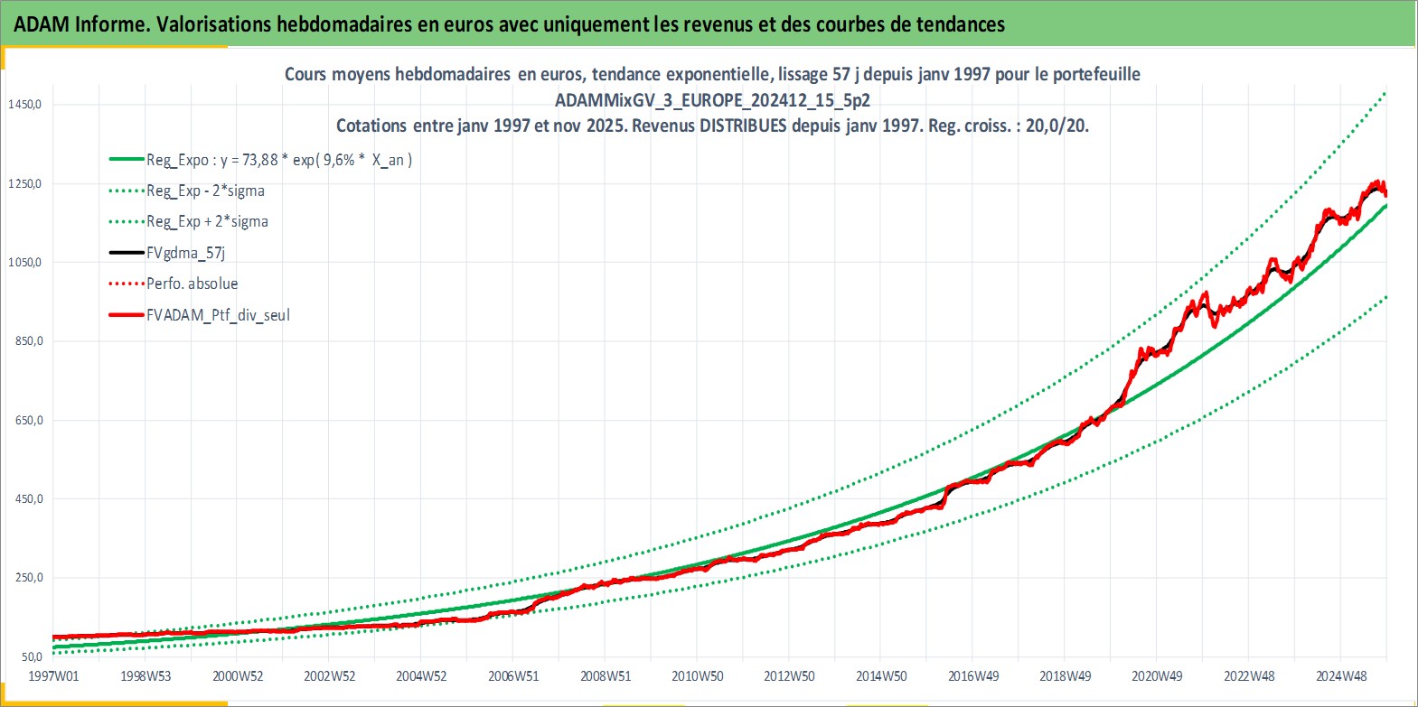 Site dédié aux investisseursPage dédiée sur site financeAnalyse des valorisations hebdomadaires du portefeuille ADAMMixGV_3_EUROPE_202412_15_5p2_11actifs avec un profil P6_PurActions. Ce portefeuille est cote en EUR. Les valorisations couvrent les semaines 1997W01 a 2025W48. Les revenus de cet actif financier sont pris en compte depuis la semaine 1997W01. La note globale ESG de cet actif est estimee a 13.8 (apres rebasage entre 0 et 20).