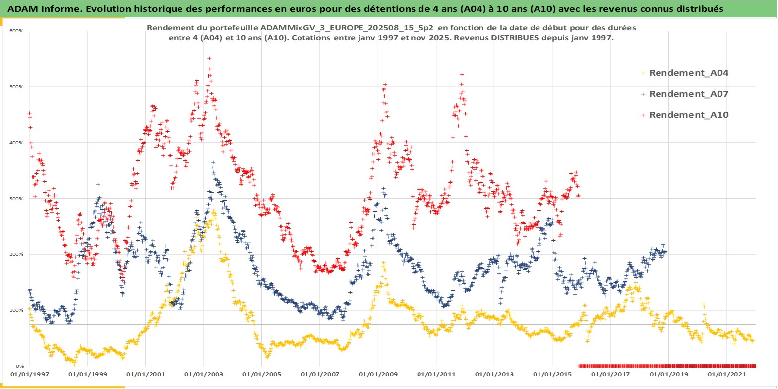 Site dédié aux investisseursPage dédiée sur site financeAnalyse des valorisations hebdomadaires du portefeuille ADAMMixGV_3_EUROPE_202508_15_5p2_12actifs avec un profil P6_PurActions. Ce portefeuille est cote en EUR. Les valorisations couvrent les semaines 1997W01 a 2025W48. Les revenus de cet actif financier sont pris en compte depuis la semaine 1997W01. La note globale ESG de cet actif est estimee a 14.4 (apres rebasage entre 0 et 20).
