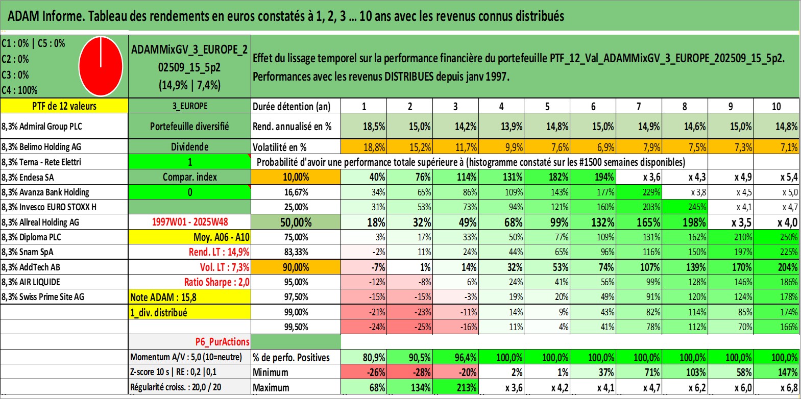 Site dédié aux investisseursPage dédiée sur site financeAnalyse des valorisations hebdomadaires du portefeuille ADAMMixGV_3_EUROPE_202509_15_5p2_12actifs avec un profil P6_PurActions. Ce portefeuille est cote en EUR. Les valorisations couvrent les semaines 1997W01 a 2025W48. Les revenus de cet actif financier sont pris en compte depuis la semaine 1997W01. La note globale ESG de cet actif est estimee a 13.5 (apres rebasage entre 0 et 20).