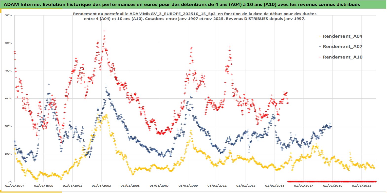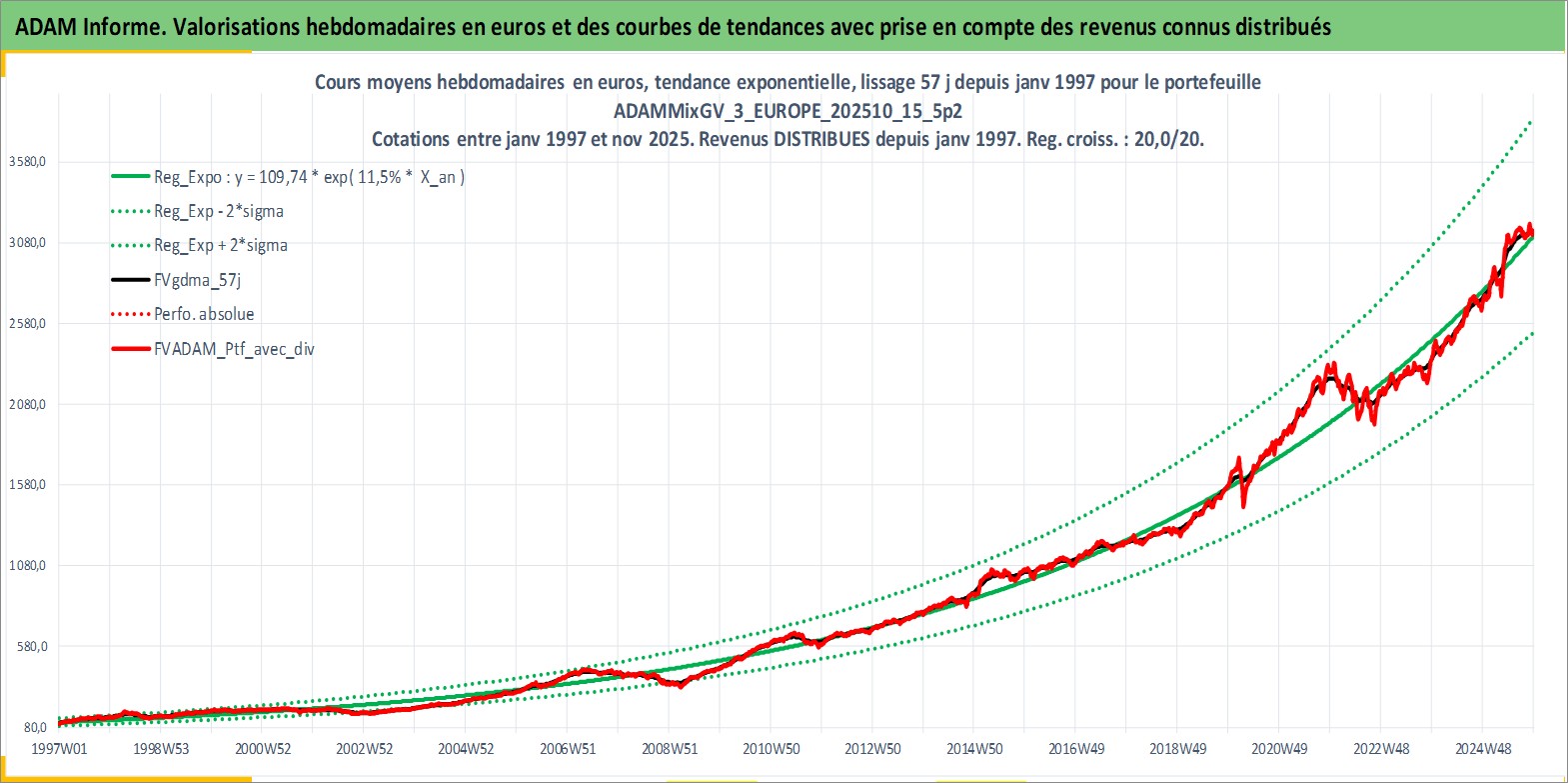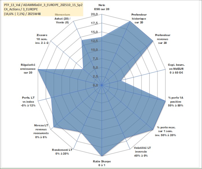 Site dédié aux investisseursPage dédiée sur site financeAnalyse des valorisations hebdomadaires du portefeuille ADAMMixGV_3_EUROPE_202510_15_5p2_13actifs avec un profil P6_PurActions. Ce portefeuille est cote en EUR. Les valorisations couvrent les semaines 1997W01 a 2025W48. Les revenus de cet actif financier sont pris en compte depuis la semaine 1997W01. La note globale ESG de cet actif est estimee a 13.5 (apres rebasage entre 0 et 20).
