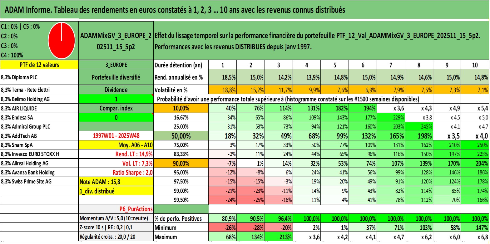 Site dédié aux investisseursPage dédiée sur site financeAnalyse des valorisations hebdomadaires du portefeuille ADAMMixGV_3_EUROPE_202511_15_5p2_12actifs avec un profil P6_PurActions. Ce portefeuille est cote en EUR. Les valorisations couvrent les semaines 1997W01 a 2025W48. Les revenus de cet actif financier sont pris en compte depuis la semaine 1997W01. La note globale ESG de cet actif est estimee a 13.5 (apres rebasage entre 0 et 20).