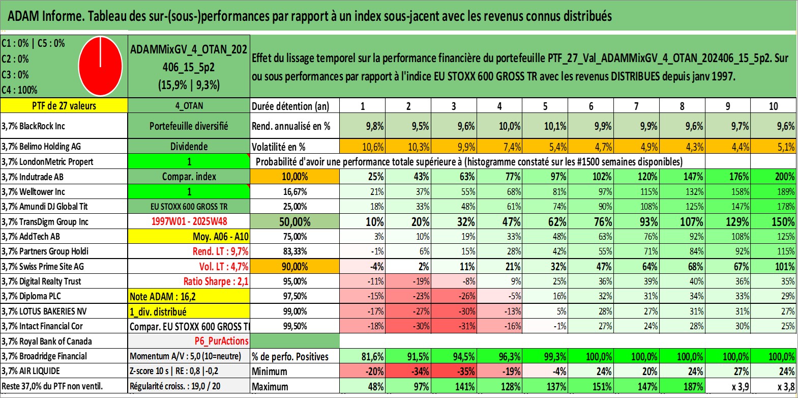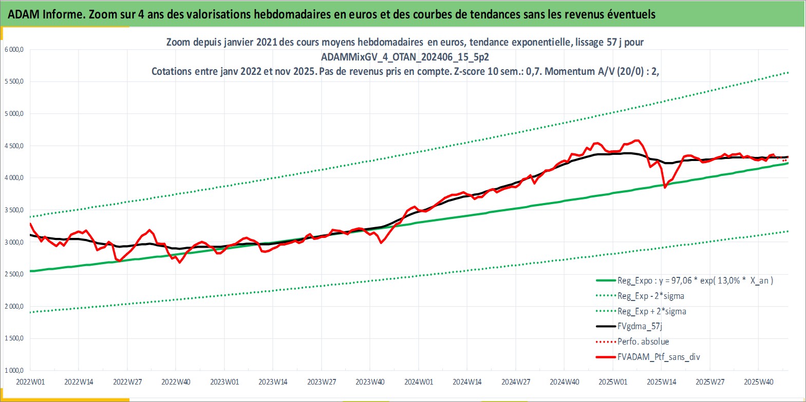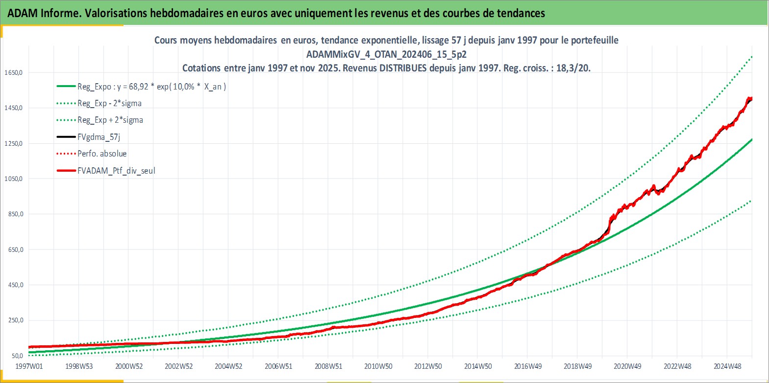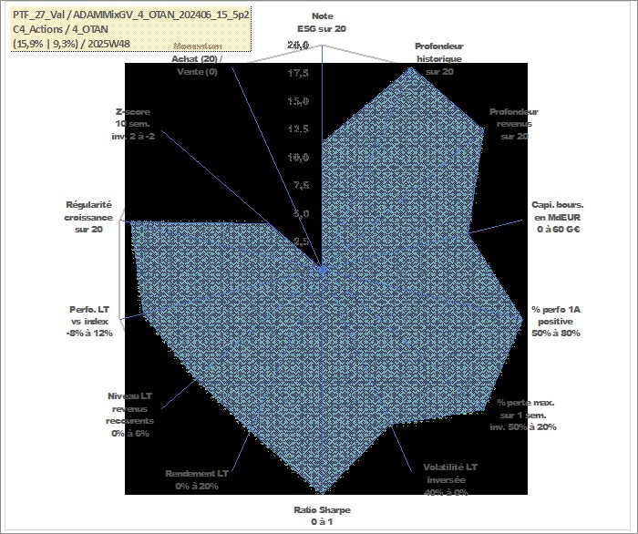 Site dédié aux investisseursPage dédiée sur site financeAnalyse des valorisations hebdomadaires du portefeuille ADAMMixGV_4_OTAN_202406_15_5p2_27actifs avec un profil P6_PurActions. Ce portefeuille est cote en EUR. Les valorisations couvrent les semaines 1997W01 a 2025W48. Les revenus de cet actif financier sont pris en compte depuis la semaine 1997W01. La note globale ESG de cet actif est estimee a 11.3 (apres rebasage entre 0 et 20).