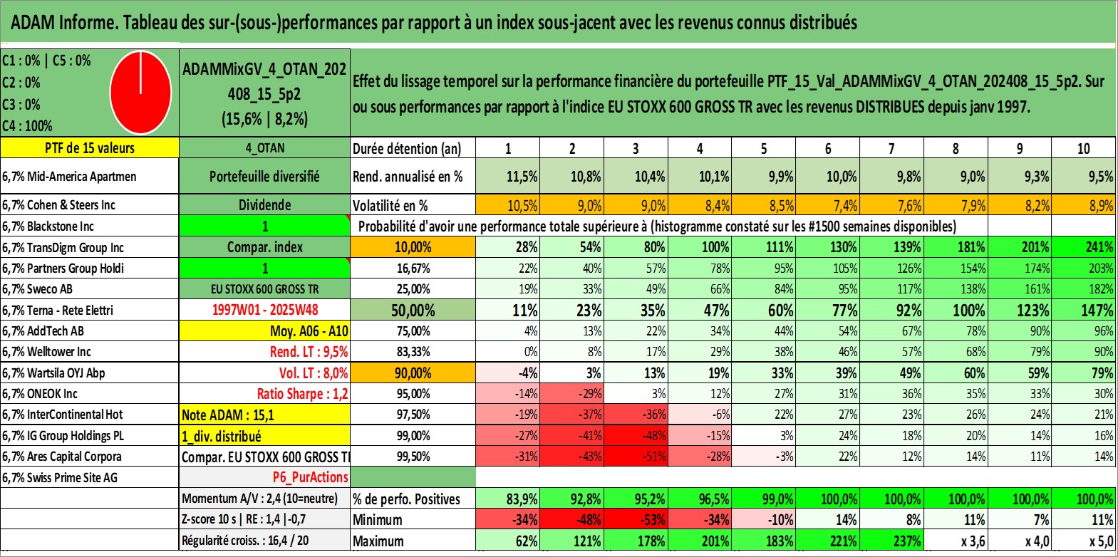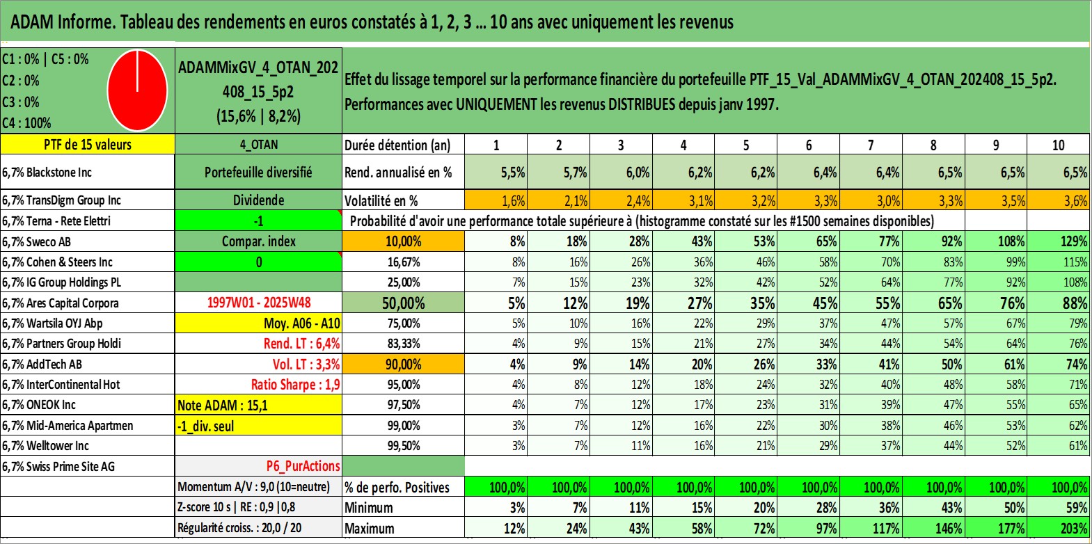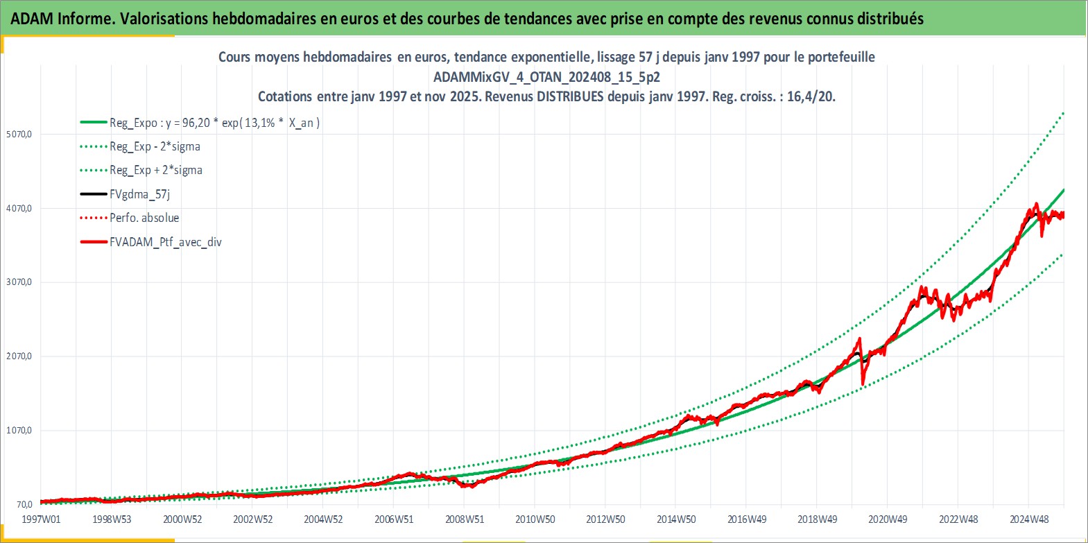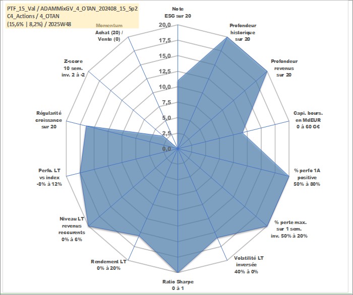Site dédié aux investisseursPage dédiée sur site financeAnalyse des valorisations hebdomadaires du portefeuille ADAMMixGV_4_OTAN_202408_15_5p2_15actifs avec un profil P6_PurActions. Ce portefeuille est cote en EUR. Les valorisations couvrent les semaines 1997W01 a 2025W48. Les revenus de cet actif financier sont pris en compte depuis la semaine 1997W01. La note globale ESG de cet actif est estimee a 11.0 (apres rebasage entre 0 et 20).