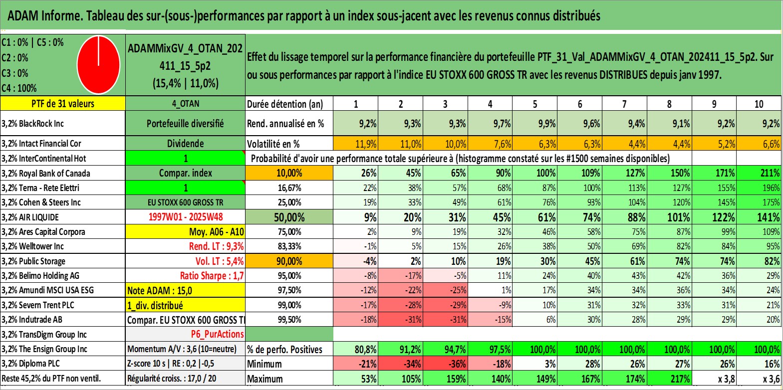 Site dédié aux investisseursPage dédiée sur site financeAnalyse des valorisations hebdomadaires du portefeuille ADAMMixGV_4_OTAN_202411_15_5p2_31actifs avec un profil P6_PurActions. Ce portefeuille est cote en EUR. Les valorisations couvrent les semaines 1997W01 a 2025W48. Les revenus de cet actif financier sont pris en compte depuis la semaine 1997W01. La note globale ESG de cet actif est estimee a 12.0 (apres rebasage entre 0 et 20).