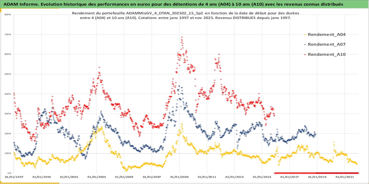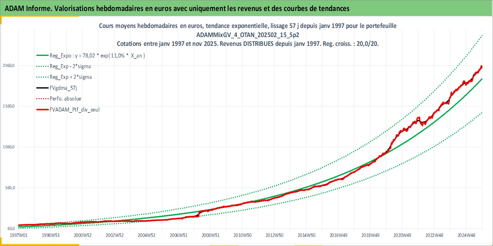 Site dédié aux investisseursPage dédiée sur site financeAnalyse des valorisations hebdomadaires du portefeuille ADAMMixGV_4_OTAN_202502_15_5p2_29actifs avec un profil P6_PurActions. Ce portefeuille est cote en EUR. Les valorisations couvrent les semaines 1997W01 a 2025W48. Les revenus de cet actif financier sont pris en compte depuis la semaine 1997W01. La note globale ESG de cet actif est estimee a 11.4 (apres rebasage entre 0 et 20).