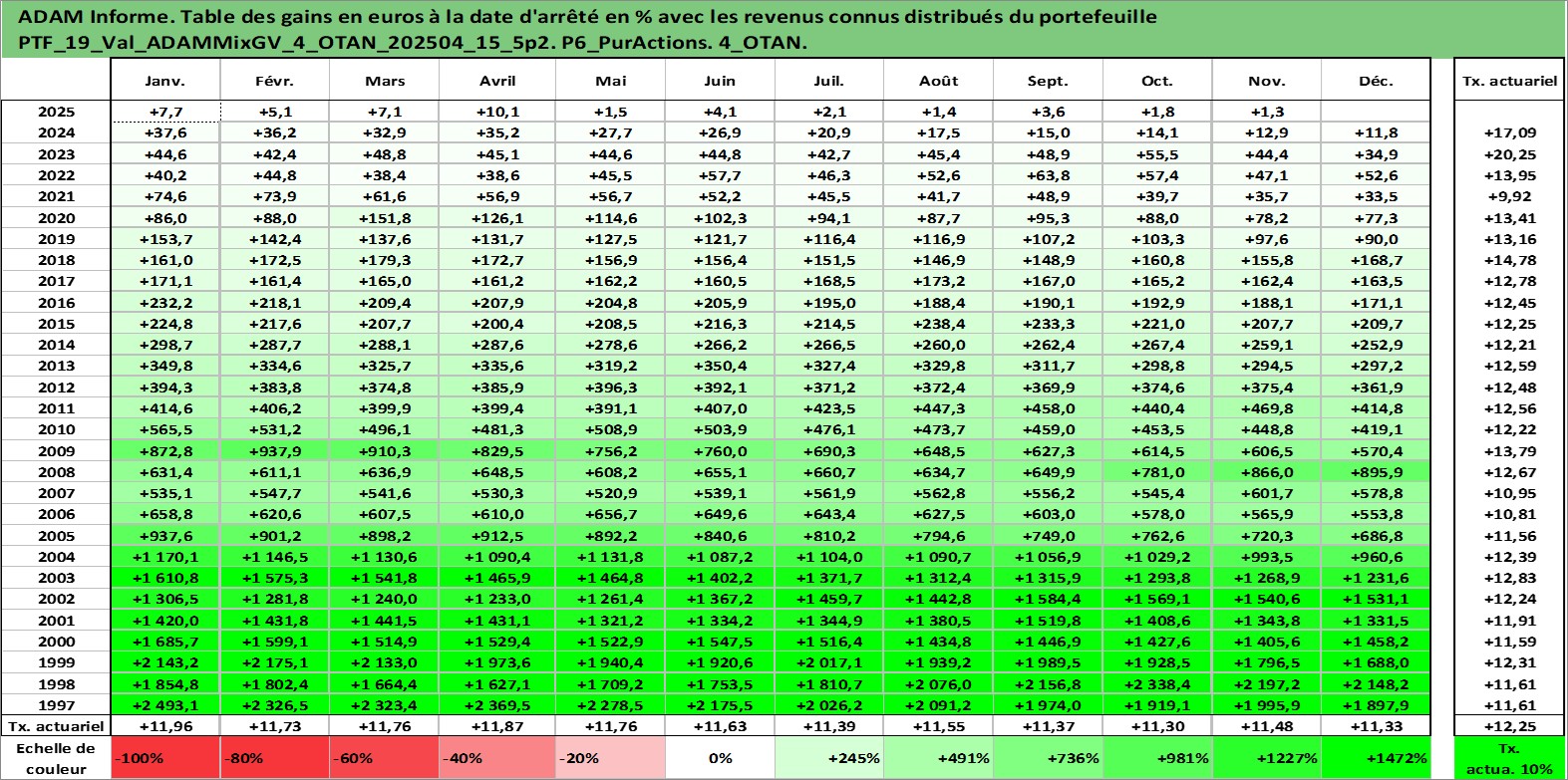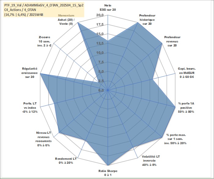 Site dédié aux investisseursPage dédiée sur site financeAnalyse des valorisations hebdomadaires du portefeuille ADAMMixGV_4_OTAN_202504_15_5p2_19actifs avec un profil P6_PurActions. Ce portefeuille est cote en EUR. Les valorisations couvrent les semaines 1997W01 a 2025W48. Les revenus de cet actif financier sont pris en compte depuis la semaine 1997W01. La note globale ESG de cet actif est estimee a 13.1 (apres rebasage entre 0 et 20).