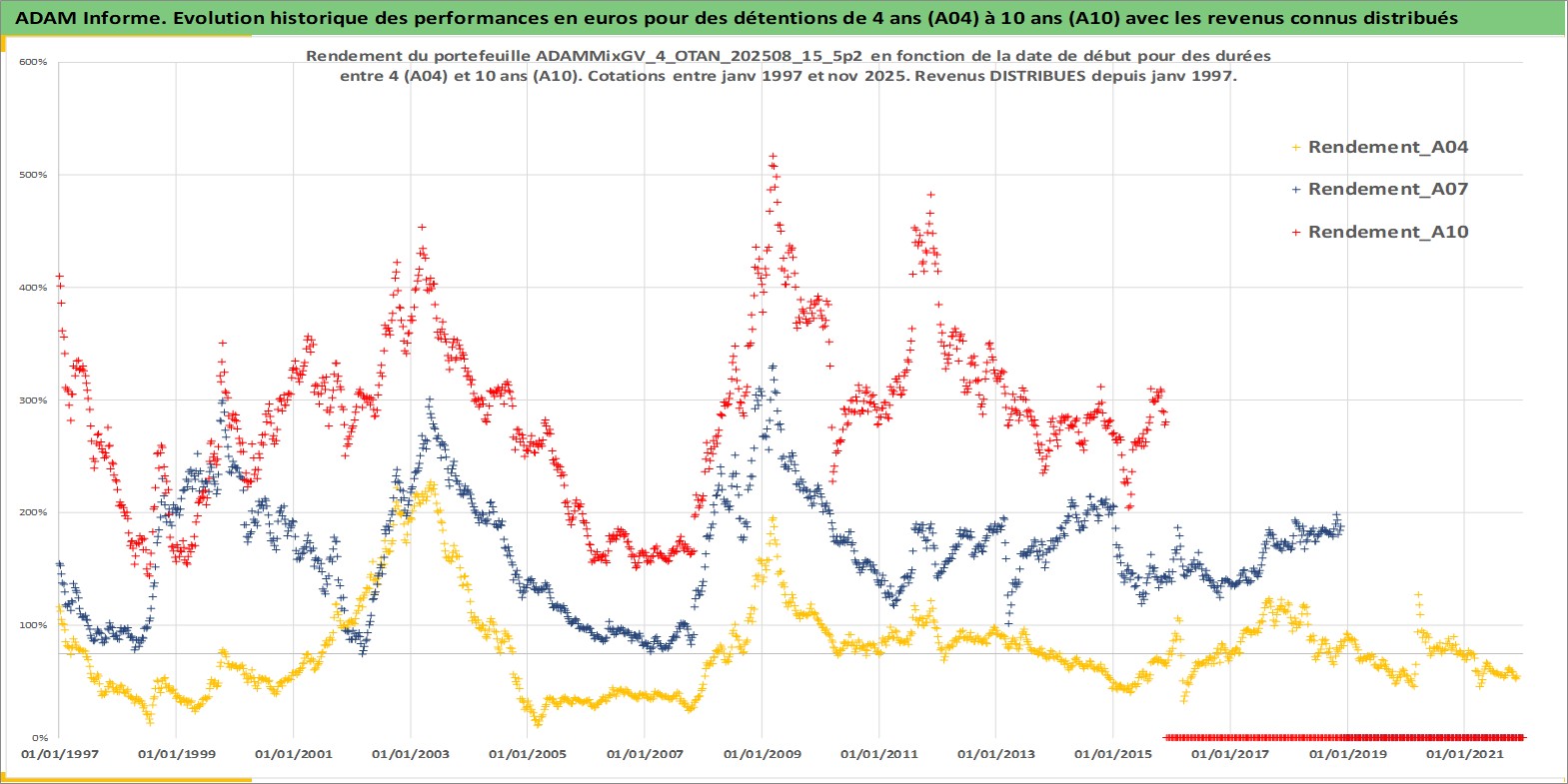 Site dédié aux investisseursPage dédiée sur site financeAnalyse des valorisations hebdomadaires du portefeuille ADAMMixGV_4_OTAN_202508_15_5p2_21actifs avec un profil P6_PurActions. Ce portefeuille est cote en EUR. Les valorisations couvrent les semaines 1997W01 a 2025W48. Les revenus de cet actif financier sont pris en compte depuis la semaine 1997W01. La note globale ESG de cet actif est estimee a 12.4 (apres rebasage entre 0 et 20).