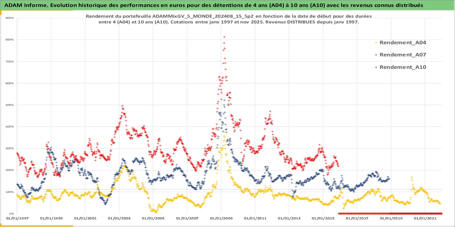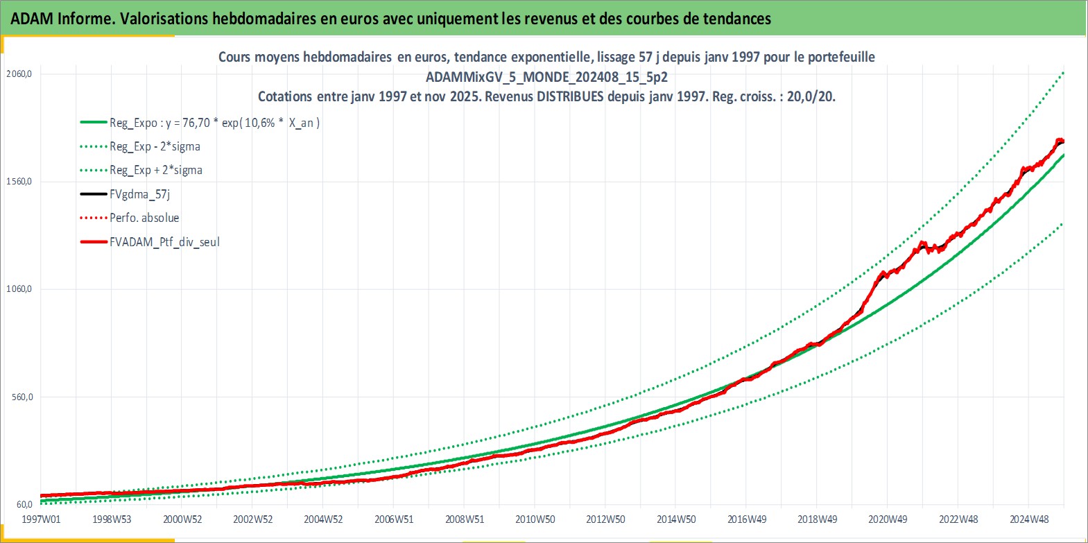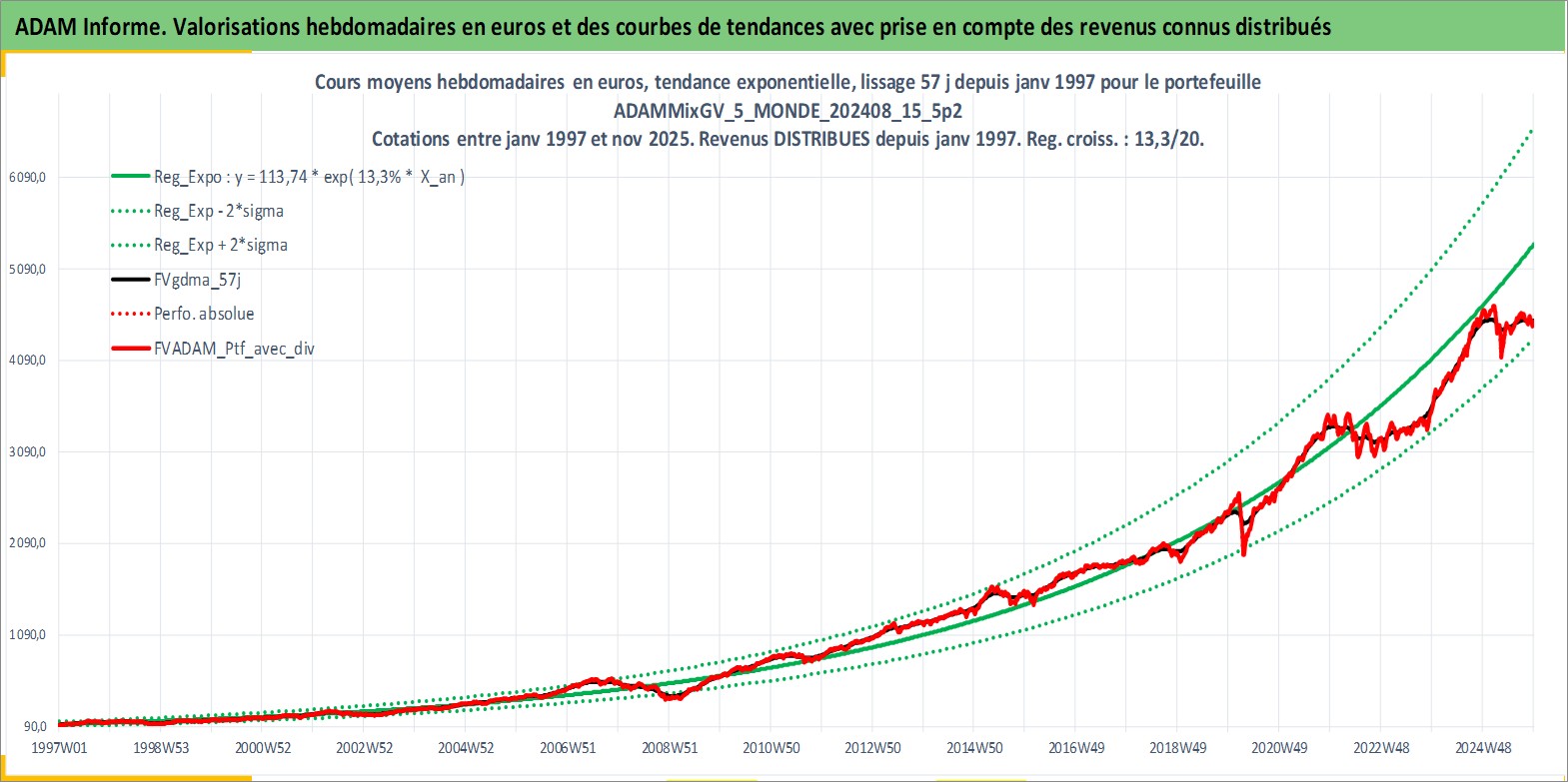 Site dédié aux investisseursPage dédiée sur site financeAnalyse des valorisations hebdomadaires du portefeuille ADAMMixGV_5_MONDE_202408_15_5p2_27actifs avec un profil P6_PurActions. Ce portefeuille est cote en EUR. Les valorisations couvrent les semaines 1997W01 a 2025W48. Les revenus de cet actif financier sont pris en compte depuis la semaine 1997W01. La note globale ESG de cet actif est estimee a 9.3 (apres rebasage entre 0 et 20).