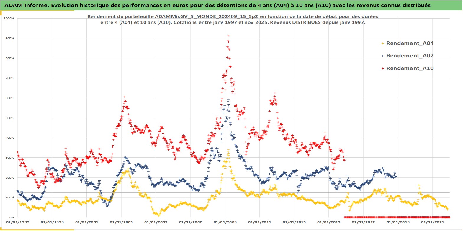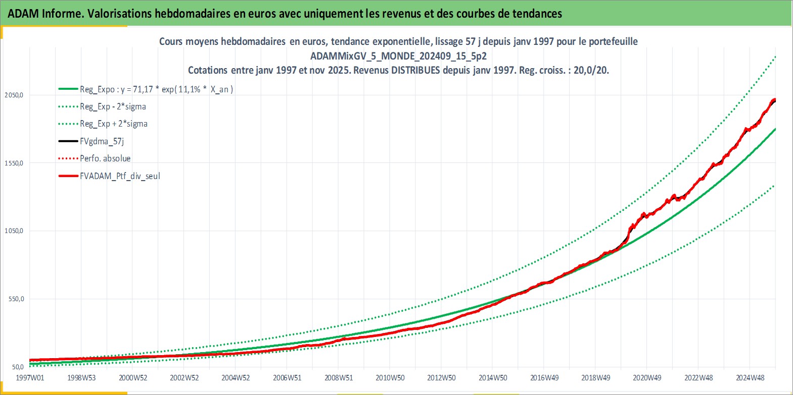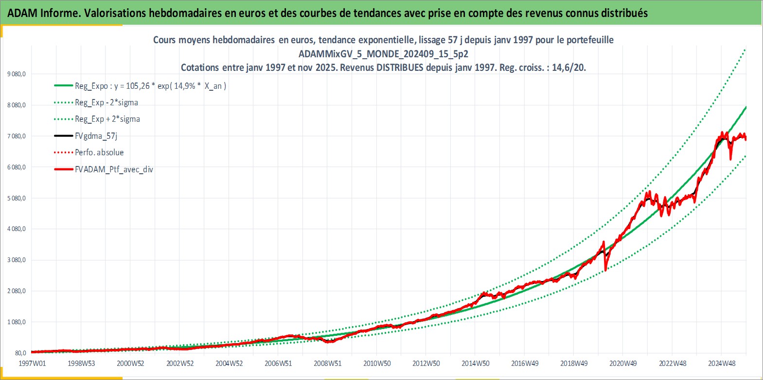 Site dédié aux investisseursPage dédiée sur site financeAnalyse des valorisations hebdomadaires du portefeuille ADAMMixGV_5_MONDE_202409_15_5p2_34actifs avec un profil P6_PurActions. Ce portefeuille est cote en EUR. Les valorisations couvrent les semaines 1997W01 a 2025W48. Les revenus de cet actif financier sont pris en compte depuis la semaine 1997W01. La note globale ESG de cet actif est estimee a 12.1 (apres rebasage entre 0 et 20).