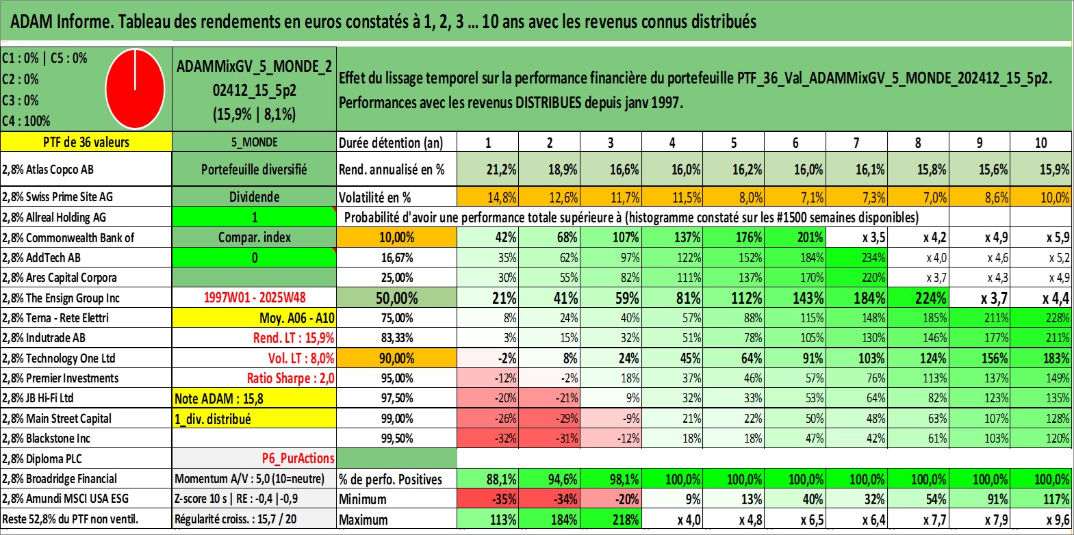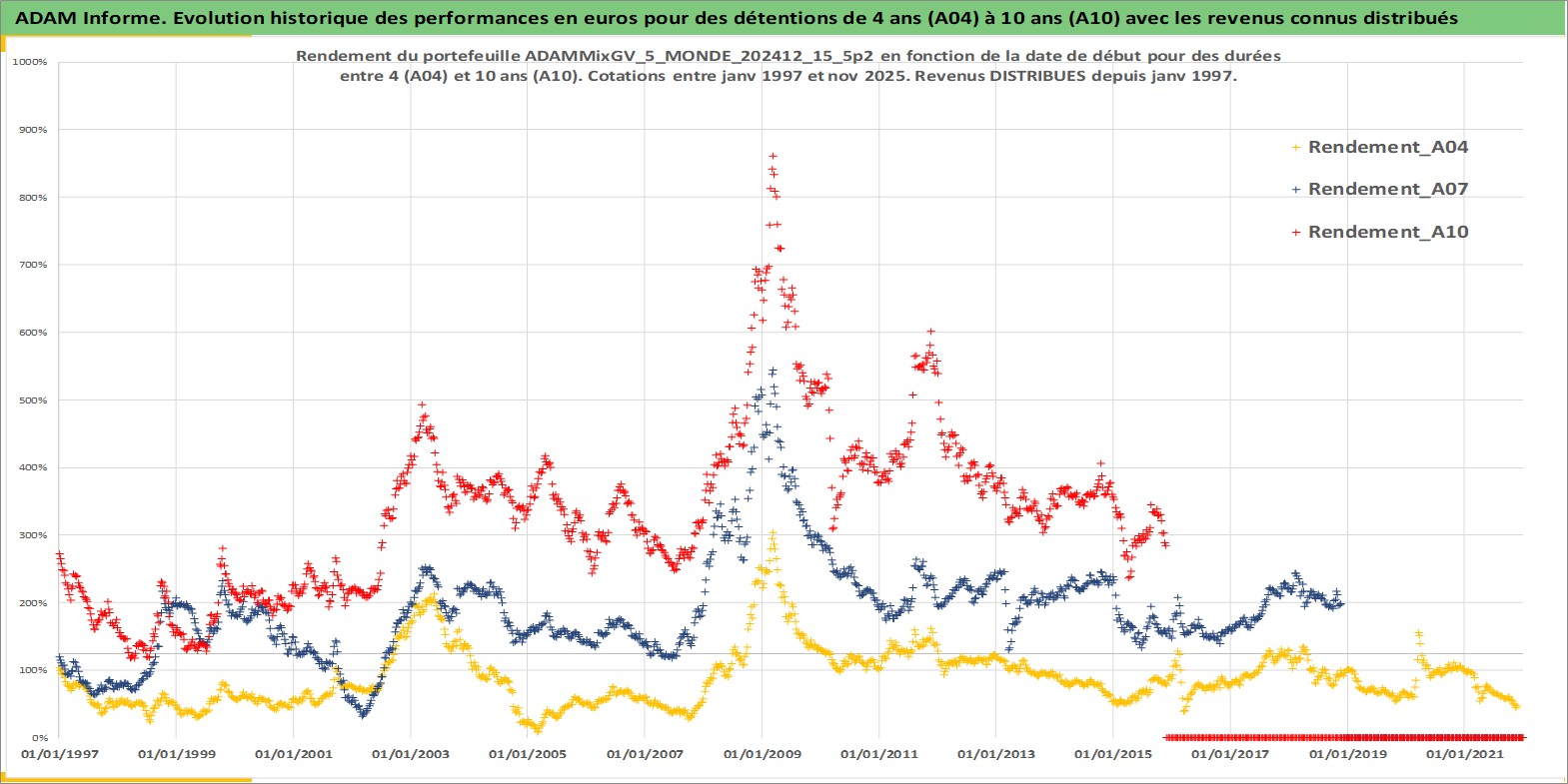 Site dédié aux investisseursPage dédiée sur site financeAnalyse des valorisations hebdomadaires du portefeuille ADAMMixGV_5_MONDE_202412_15_5p2_36actifs avec un profil P6_PurActions. Ce portefeuille est cote en EUR. Les valorisations couvrent les semaines 1997W01 a 2025W48. Les revenus de cet actif financier sont pris en compte depuis la semaine 1997W01. La note globale ESG de cet actif est estimee a 12.1 (apres rebasage entre 0 et 20).