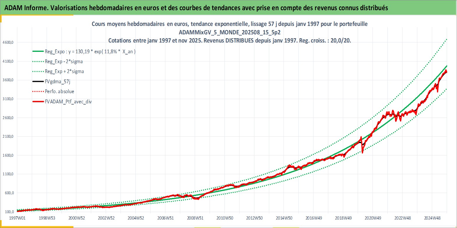 Site dédié aux investisseursPage dédiée sur site financeAnalyse des valorisations hebdomadaires du portefeuille ADAMMixGV_5_MONDE_202508_15_5p2_28actifs avec un profil P6_PurActions. Ce portefeuille est cote en EUR. Les valorisations couvrent les semaines 1997W01 a 2025W48. Les revenus de cet actif financier sont pris en compte depuis la semaine 1997W01. La note globale ESG de cet actif est estimee a 12.1 (apres rebasage entre 0 et 20).