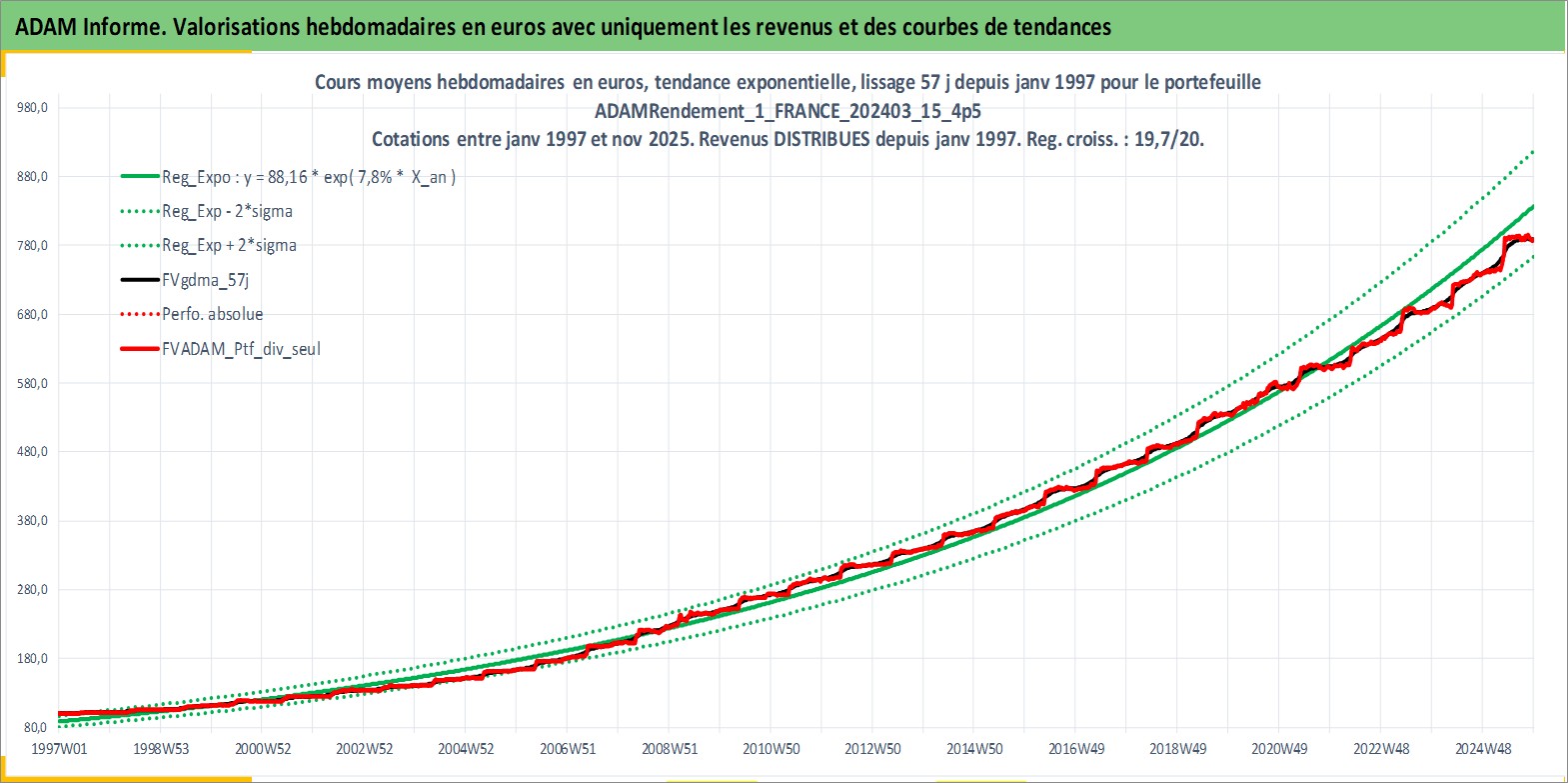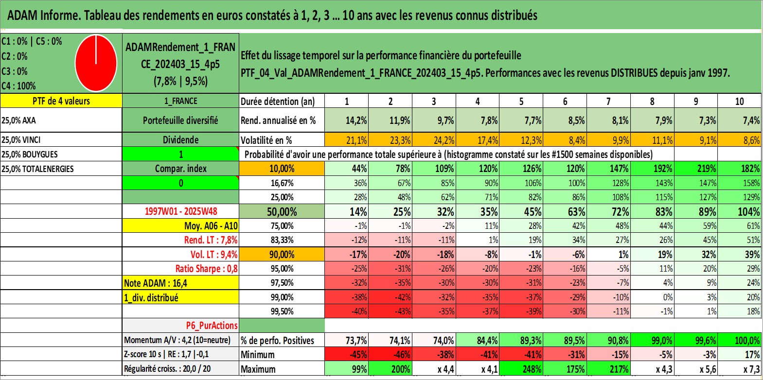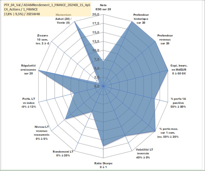 Site dédié aux investisseursPage dédiée sur site financeAnalyse des valorisations hebdomadaires du portefeuille ADAMRendement_1_FRANCE_202403_15_4p5_4actifs avec un profil P6_PurActions. Ce portefeuille est cote en EUR. Les valorisations couvrent les semaines 1997W01 a 2025W48. Les revenus de cet actif financier sont pris en compte depuis la semaine 1997W01. La note globale ESG de cet actif est estimee a 6.8 (apres rebasage entre 0 et 20).